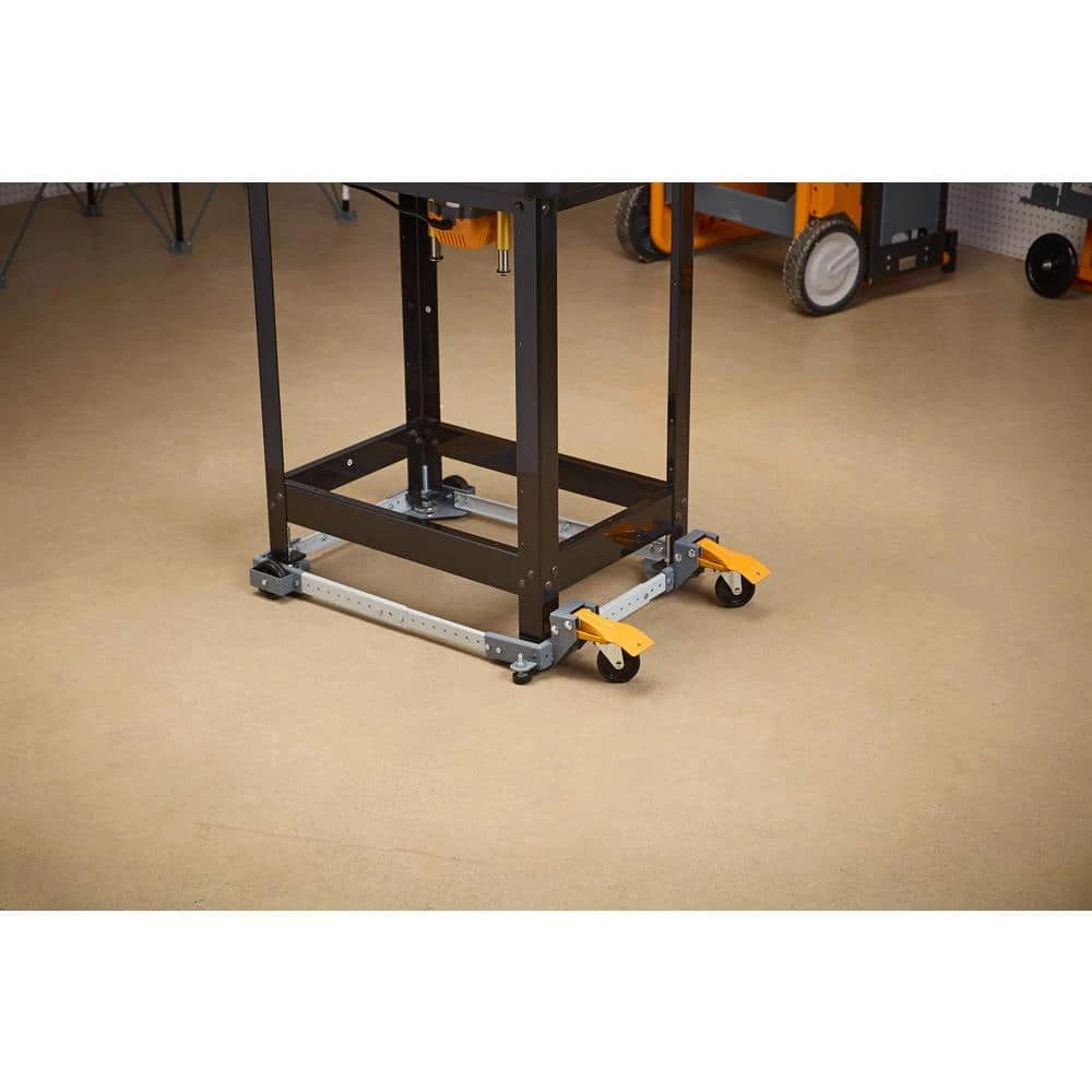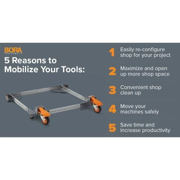 With the BORA PM-2500 universal mobile base, it’s never been easier to move equipment around a crowded shop. This fully adjustable mobile base features side rails and corner pieces with holes spaced every inch to insure the perfect fit for your machine. Move band saws, table saws, sanders, drill presses, jointers, planers and much more. You’ll be able to open up space for more effective productivity, better organization safety and added convenience during cleanup. This base to fit almost any large woodworking machine, forming squares from 12″ by 12″ to 36″ by 36″ and rectangles up to 20″ by 52″. There are predrilled holes in 1-inch increments that allow you to choose the shape you need. 3-inch ball bearing wheels at each corner makes it easy to maneuver. The heavy-duty steel foot-operated levers lock machines to the floor during use and are auick to activate for mobility. The PM-2500 has a maximum weight capacity of 650 lbs. All parts are included, and it’s backed by a one-year limited warranty.