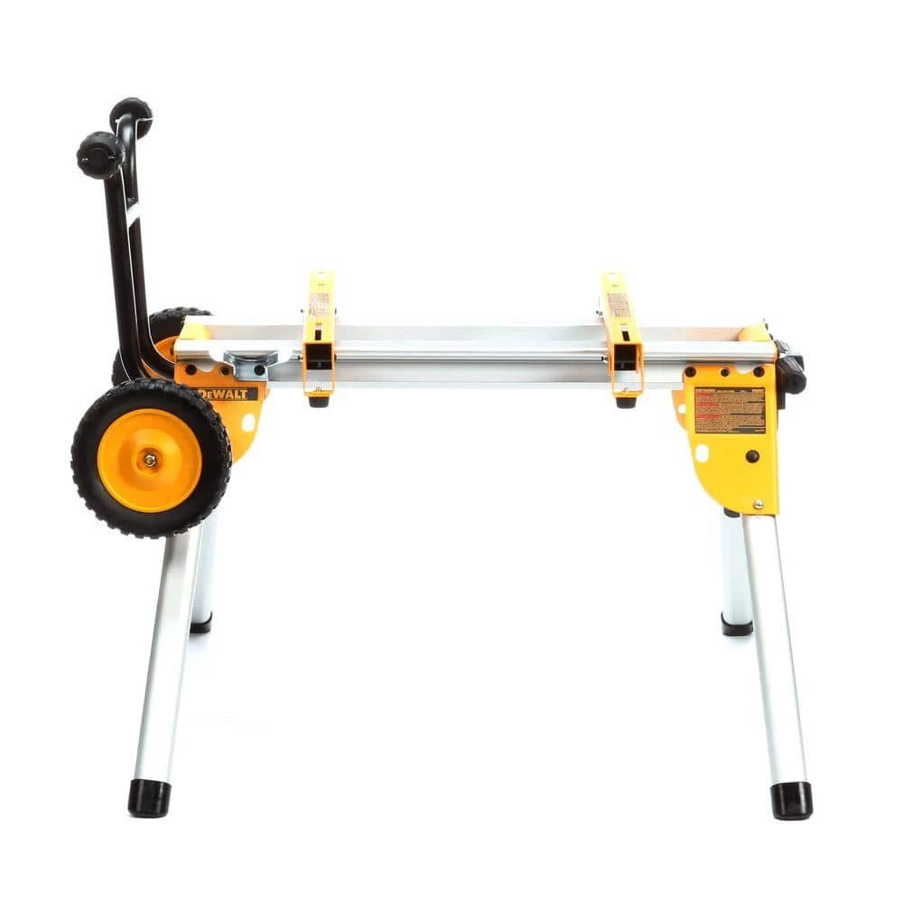 The DEWALT DW7440RS Rolling Table Saw Stand has a lightweight design, weighing only 33 lbs. The heavy-duty kickstand allows the tool stand to balance upright for mobility and storage. Folding legs with quick-release levers collapse under the table saw stand, minimizing overall size for transport and storage. The retractable soft grip handle allows the user to pull this portable table saw stand behind them comfortably with the weight of the saw near the ground. The quick connect stand brackets are attached to the saw for easy detachment from the rolling stand for loading and unloading. The DW7440RS includes: rolling table saw stand and quick connect stand brackets; table saw sold separately.