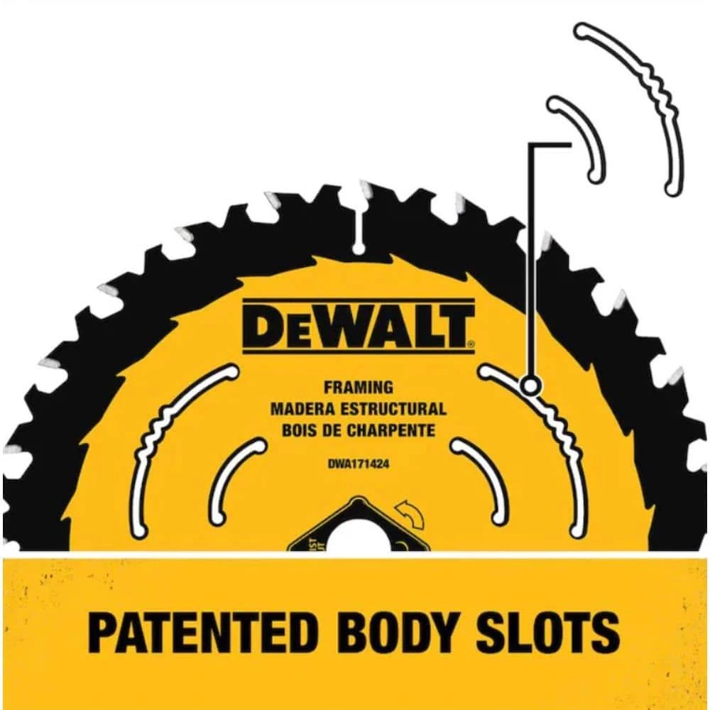 DEWALT Saw Blades are ideal for any wood-cutting application. The exclusive, patent-pending ToughTrack tooth design, on our framing and ripping blades, is engineered to deliver straight, accurate cuts over the life of the blade. Patented Body Slots reduce vibration, which works with the blade’s thin kerf design to deliver exceptional user feel. High-Density Tungsten Carbide teeth are tough, wear-resistant, and provide long life. The reinforced shoulder is designed for strength and durability by providing impact resistance, especially in nail-embedded wood. These blades come with ToughCoat anti-stick coating to reduce friction and gumming. Optimized for use on both corded and cordless circular saws.