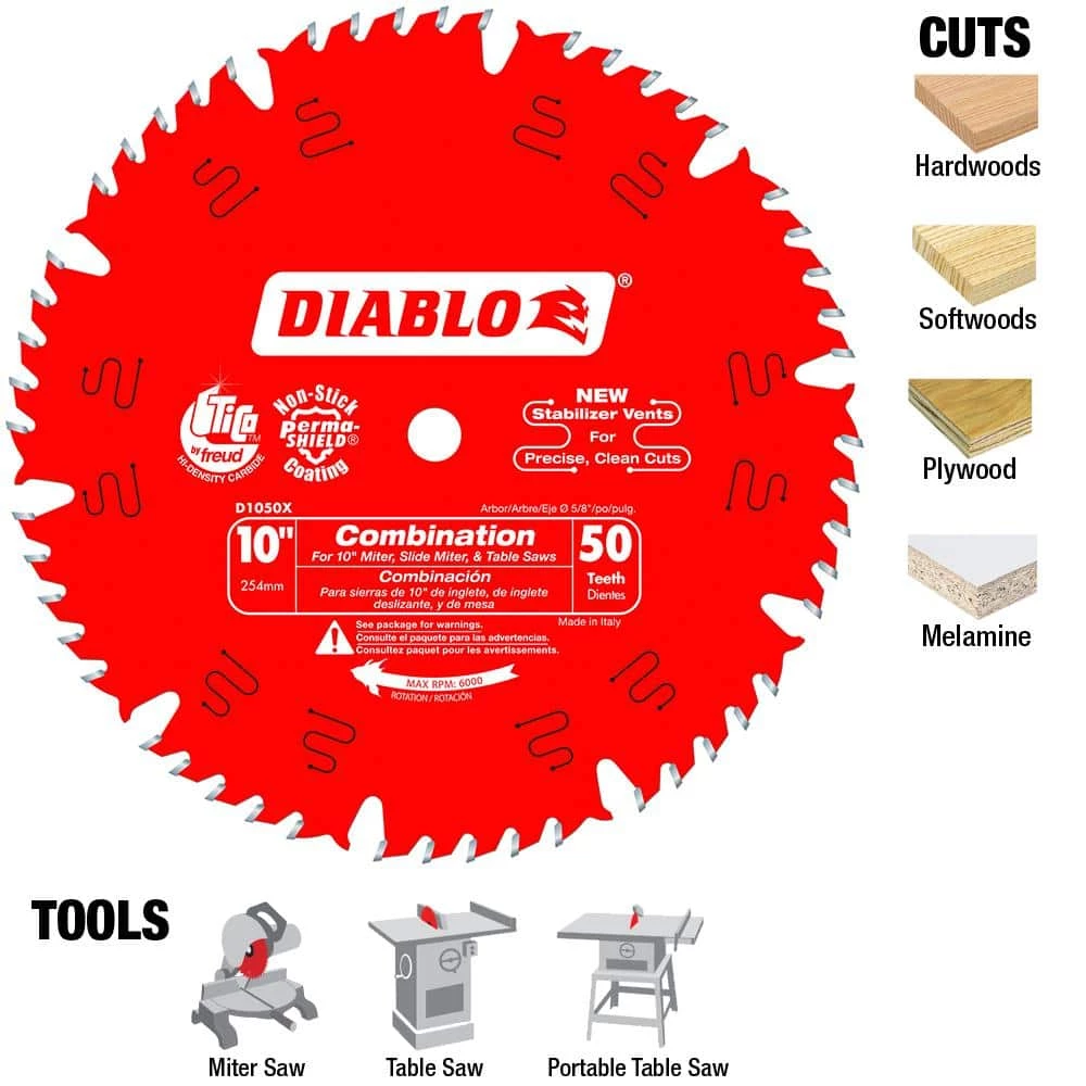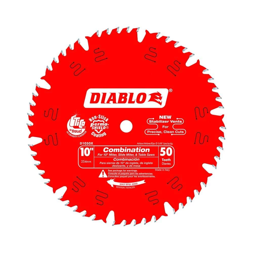 Diablo’s next generation 10 in. x 50 Tooth Combination Carbide Circular Saw Blade features new laser-cut stabilizer vents for precise and clean cuts in a variety of wood materials. The advanced stabilizer vents feature a permanent filler baked in from top to bottom for absorbing noise and preventing sideways movement, allowing the blade to slice through wood cleanly, quickly and accurately. Constructed with TiCo Hi-Density special-blend carbide, Diablo’s 10 in. combination blade produces razor sharp cuts and provides 5X longer cutting life. The laser cut heat expansion slots allow the blade to expand and contract during use, keeping the cut true and straight. This blade is excellent when working on multi-purpose projects such as cabinet work, millwork and furniture construction.