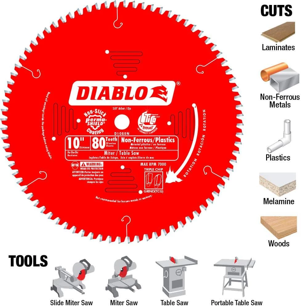 Diablo’s next generation 10 in. x 80 Tooth Non-Ferrous/Plastics Carbide Circular Saw Blade features new laser-cut stabilizer vents for precise and clean cuts in non-ferrous metals and plastic materials. The advanced stabilizer vents feature a permanent filler baked in from top to bottom for absorbing noise and preventing sideways movement, allowing the blade to slice through materials cleanly, quickly and accurately. Constructed with TiCo Hi-Density special-blend carbide, Diablo’s 10 in. non-ferrous metals/plastics blade produces precise cuts and provides 5X longer cutting life. The laser cut heat expansion slots allow the blade to expand and contract during use, keeping the cut true and straight. This blade is excellent for cutting plastics, brass, aluminum, copper and fiberglass.
