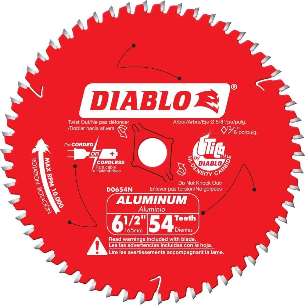 DIABLO’s next generation Aluminum saw blades are optimized for cutting thin (up to 1/8 in.), medium (3/32 in. to 1/4 in.) and thick (3/16 in. to 7/16 in.) aluminum metals. Featuring the new, specially formulated DIABLO TiCo Super-Density Micro-Grain Carbide, these radical blades withstand impact, reduce wear, provide clog free cuts and last longer than standard carbide in metal cutting applications. The specially formulated metal cutting carbide teeth feature a Triple Chip Grind (TCG) Tooth Design for clean, burr-free finishes, virtually eliminating any type of rework. Tri-Metal Shock Resistant Brazing allows these Aluminum blades to slice through metal materials while withstanding extreme impact for maximum durability. DIABLO’s Aluminum saw blade series is ideal for corded and cordless saws when on-the-job cutting non-ferrous metals such as aluminum extrusions, copper pipe, brass plate, etc.