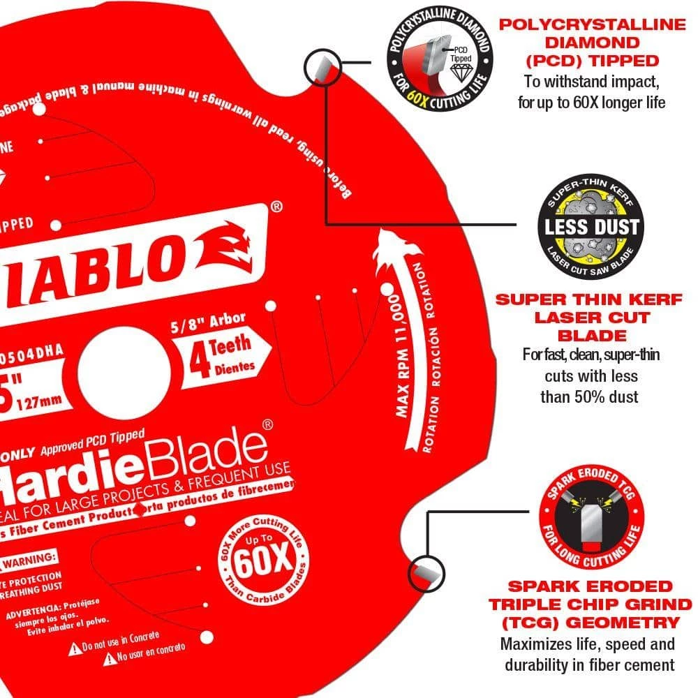 Diablo Hardie Blade is the only approved PCD (Poly Crystalline Diamond) tipped fiber cement blade recommended by James Hardie Building Products. Diablo’s co-branded Diablo blade generates up to 5% less reparable dust, while delivering the longest life in all fiber cement materials. The PCD triple chip design offers up to 60-times longer cutting life than standard carbide blades. The laser cut thin kerf design gives fast and precise cuts with less dust and waste. The anti-vibration design stabilizes the blade and reduces noise while cutting and Non-Stick PermaShield coating to reduce heat.
