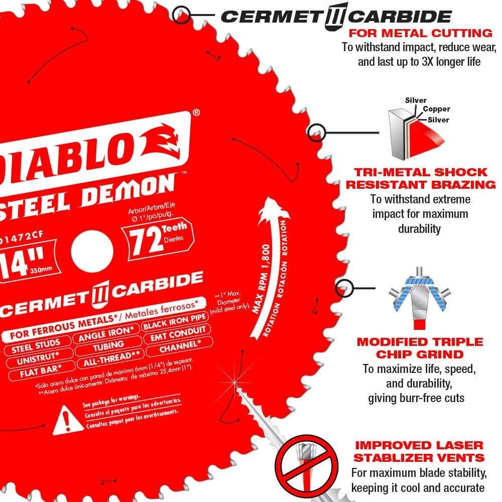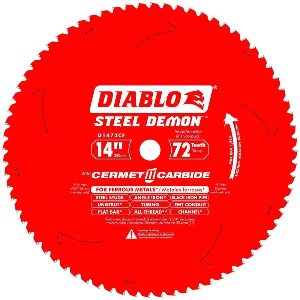 DIABLO new Steel Demon 14 in. 72-Teeth per in. Cermet circular saw blades deliver 3X the life of a standard carbide-tipped blade in metal cutting applications. This blade features new, exclusive innovation with a special Triple Chip grind and Perma-SHIELD coating to provide maximum cutting life in a wide variety of ferrous metals.