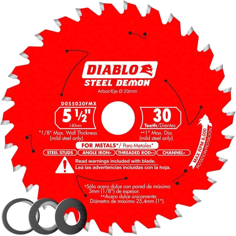 Diablos Steel Demon metal cutting saw blades produce fast, accurate cuts in mild steels without bogging down your cordless saws battery. This 20 mm arbor saw blade includes 3 additional bushings that allow your blade to also fit on 1/2 in., 5/8 in. or 10 mm arbor saws. These blades feature Diablo made TiCo Hi-Density Carbide engineered exclusively to deliver up to 40 times longer life when compared to 1 standard bonded abrasive disc in mild steel applications. Designed with a Triple Chip Grind (TCG), the blades carbide teeth produce clean, burr-free finishes, virtually eliminating any type of rework. The thin kerf body minimizes material removal and requires less cutting power, delivering fast, clean cuts.