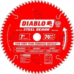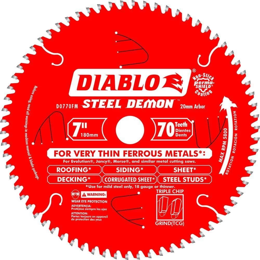 Diablo’s premium Steel Demon 7 in. x 70 Tooth 20mm Arbor Carbide Ferrous Metal Ultra Fine Saw Blade has teeth made of Ti-Co high density carbide with titanium for a design that withstands impact, reduces wear, and lasts longer that standard carbide in metal cutting applications. Tri-metal shock resistant brazing allows metal cutting carbide tips to withstand extreme impact for maximum durability. Non-stick Perma-Shield coating protects the blade from heat and corrosion, reduces friction and pitch buildup. Laser-cut stabilizer vents absorb noise and reduce vibration for a cleaner cut and longer life.