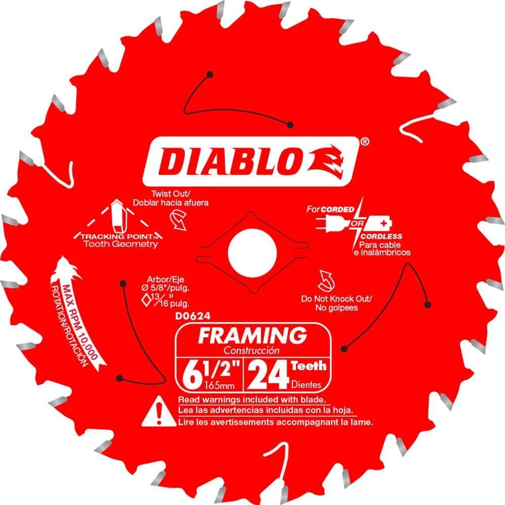 This Diablo 6-1/2 in. Saw Blade produces accurate, smooth cuts on framing materials without bogging down your power tool. Even underpowered circular saws can spin this 24-tooth saw blade with precision thanks to a super-thin kerf that minimizes material removal and produces fast, clean swaths. A Perma-SHIELD nonstick coating reduces drag while stabilizer vents absorb noise and vibration to keep the blade straight on rips and cuts.