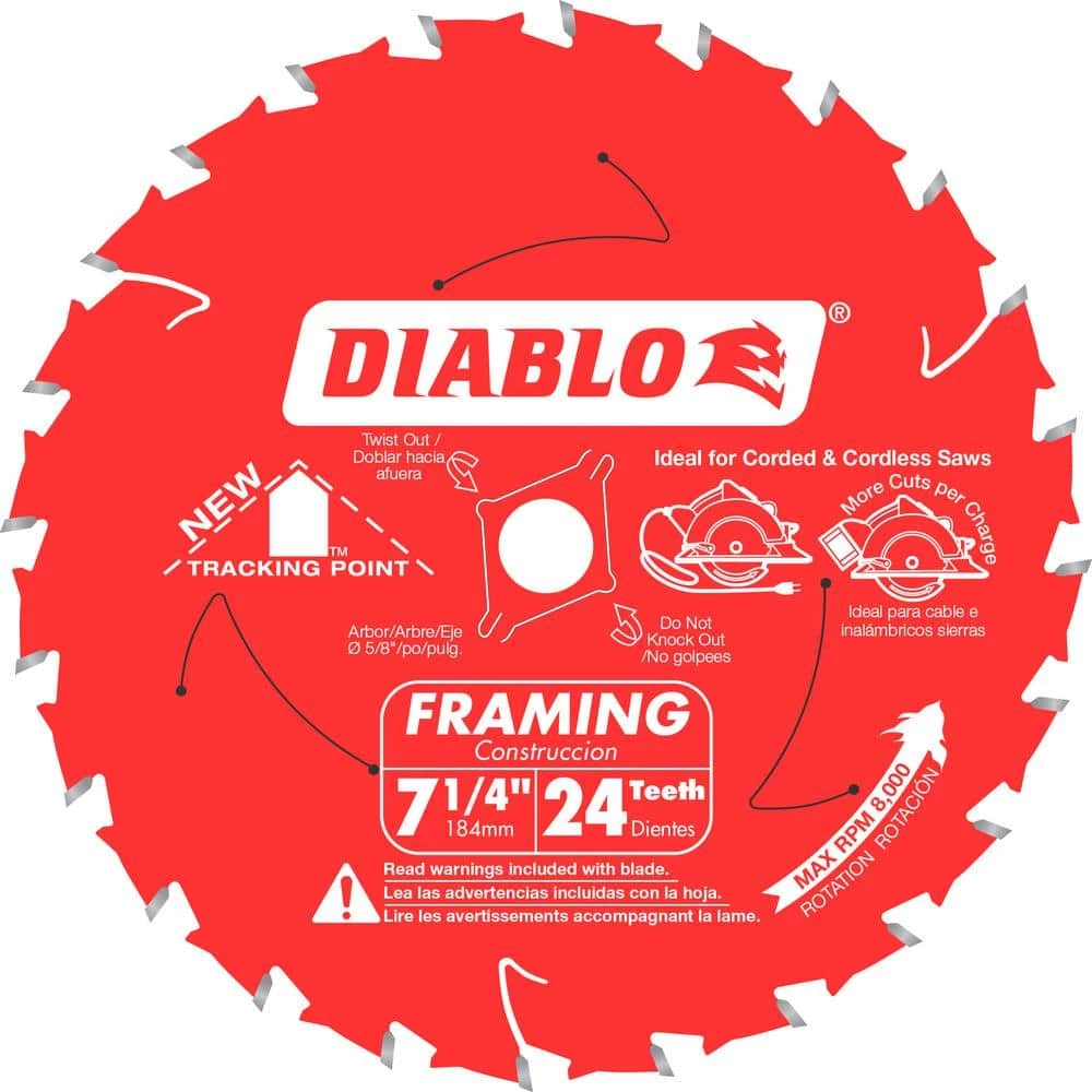 Diablos next generation 7-1/4 in. 24-teeth tracking point saw blades feature the first ever, tracking point tooth design and the newly enhanced anti-vibration design. Diablos 7-1/4 in. 24-teeth framing blade with new tracking point tooth design delivers maximum life and durability with effortless cutting performance for five times longer life, two times more durability and increased stability. Up your cutting game with this one-of-a-kind tracking point tooth grind for unmatched cutting performance and efficiency. This is the only 7-1/4 in. Blade on the market to include tracking point tooth design; making it ideal for framers, roofers, remodelers, concrete formers or anyone wanting ultimate cutting performance in pressure treated wood, 2x lumber, plywood, hardwoods and softwoods.