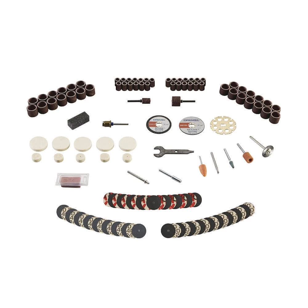 An EZ Lock mandrel, EZ Lock cut-off wheels and the handy collet fan are part of this 130-Piece kit filled with genuine Dremel accessories. Offering reusable storage bins and lift-out trays for easy organization of the included bits, this kit is ready for cutting, grinding, polishing, sanding, cleaning and more. The kit also includes sanding bands, sandpaper discs, polishing compound, felt polishing wheels, aluminum oxide grinding stones, silicon carbide grinding stone, mandrels, wire brush, wrench and a reusable carrying case with clear lid.