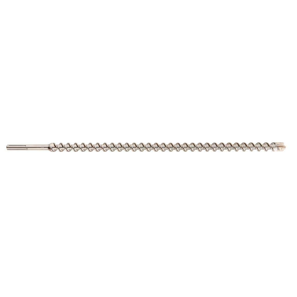 The Milwaukee SDS-Max 4-Cutter MX4 5/8 in. X 12 in. X 17 in. Drill Bits feature solid carbide heads that deliver up to 5x longer life in concrete with rebar. Engineered with rebar guards to provide maximum durability in hard aggregate and rebar. MX4 4-Cutter bits are designed with sharp centering tips for exact spot drilling in concrete. The integrated 4-cutter design prevents lock-up in rebar, reducing downtime. Variable flutes remove dust faster, reducing heat and delivering up to 15% more holes per battery charge. Wear mark indicator shows users the end of life when the bits no longer meet the ANSI requirement. The Milwaukee MX4 4-Cutter Drill Bits are ideal for concrete with rebar and masonry applications.