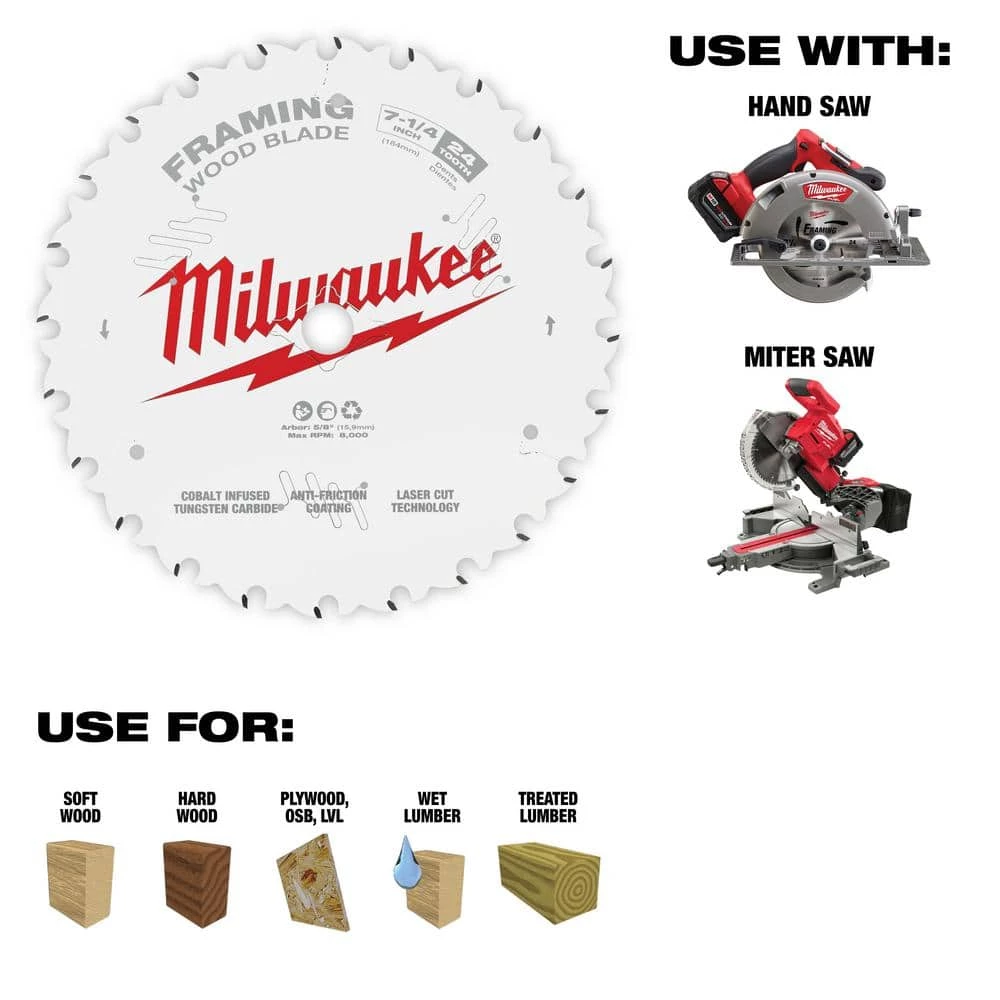 Milwaukee’s wood cutting, framing blades maximize life and cutting efficiencies to improve your productivity. An anti-friction coating keeps the blade cool while cutting and resists corrosion and gumming. Laser cutting technology creates the blade from 100% sheet steel to ensure a stable blade that increases cutting accuracy. Laser cut vibration slots minimize wobble and warping during use. A thin kerf design delivers faster cuts as well as more cuts per charge when using a cordless tool.