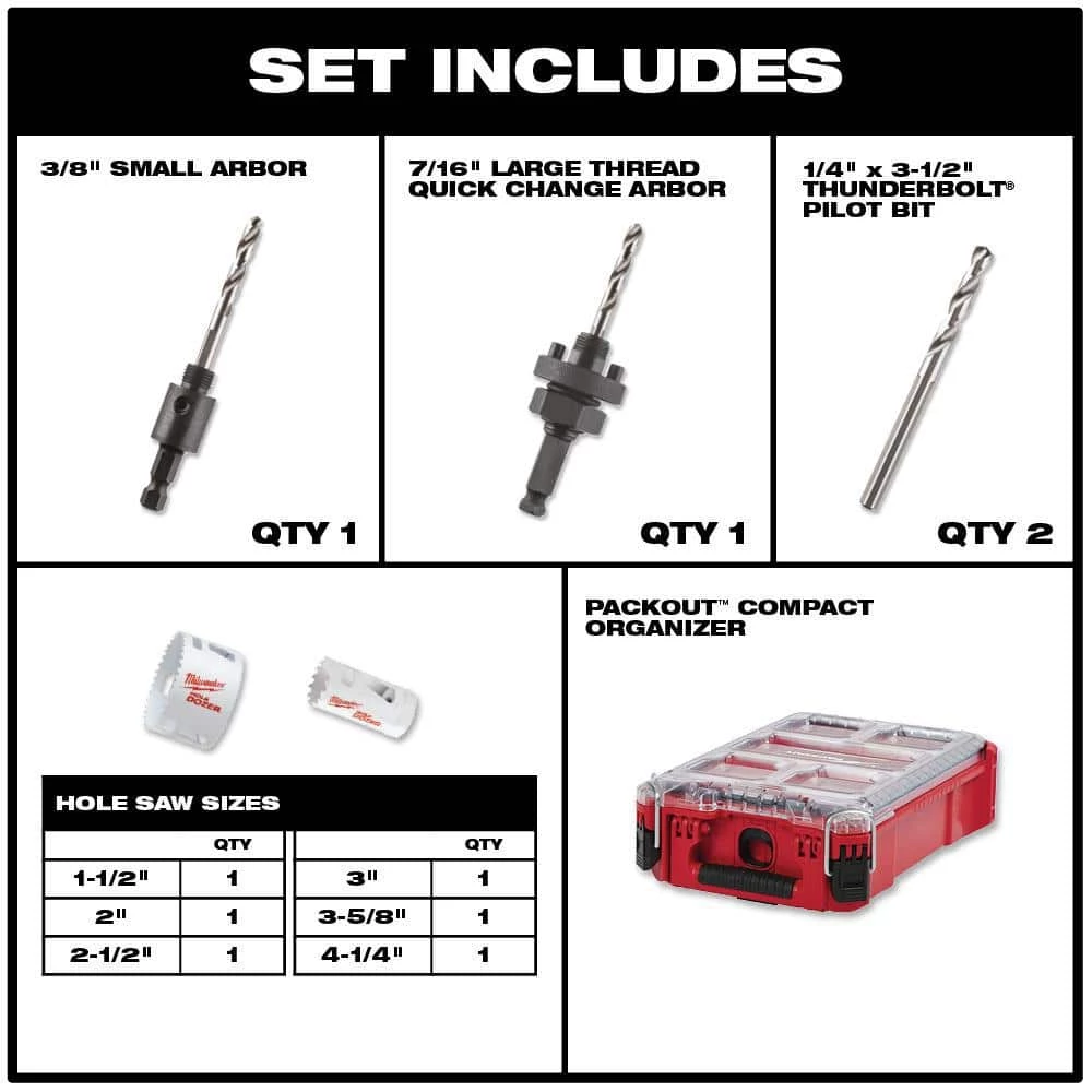 - 49-22-5606 includes: one 1-1/2 in. hole dozer one 2 in. hole dozer, one 2-1/2 in. hole dozer, one 3 in. hole dozer, one 3-5/8 in. hole dozer, one 4-1/4 in. hole dozer, one 49-56-7010 3/8 in. hex shank arbor, one 49-56-9100 7/16 in. no wobble arbor, 2 pilot bits, one 1/8 in. hex key, 1 PACKOUT compact organizer