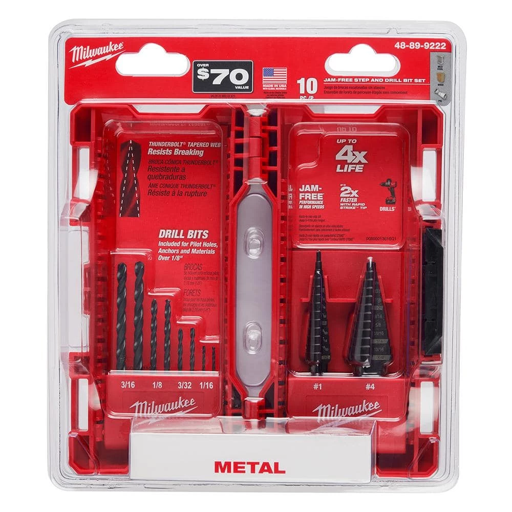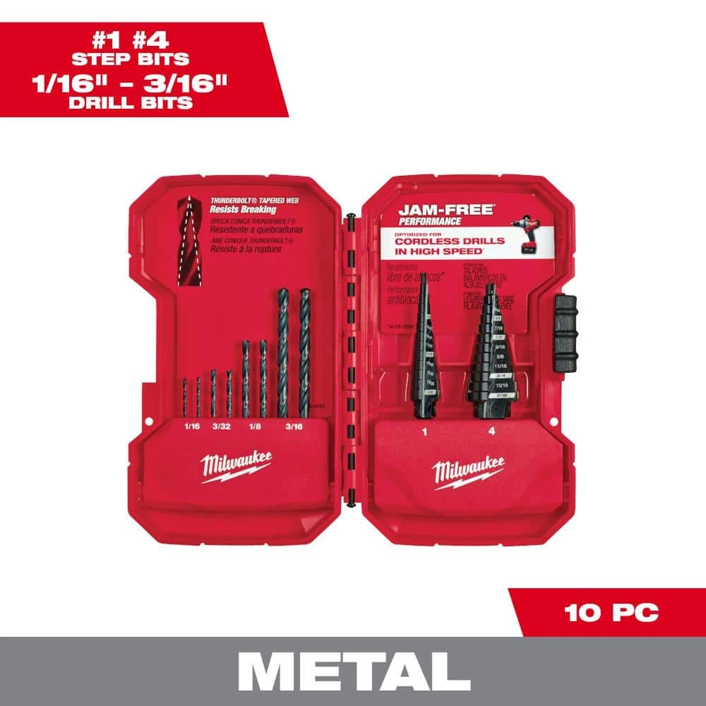 The 10 piece MILWAUKEE Step Drill Bit Kit is perfect for drilling large and small diameter holes in steel and plastic. The step drill bits give jam-free performance optimized for cordless drills in high speed. The dual-flute design creates quicker holes, longer life and more work time per battery charge. The Rapid Strike tips facilitate fast, accurate starts that generate less heat and give longer bit tip life. Black oxide coating enhances the step bits’ durability, hole quality, and bit life. Each bit has laser-engraved reference marks for ease of use and convenience while drilling. The 3-flat Secure-Grip shank ensures a solid connection with the drill chuck.