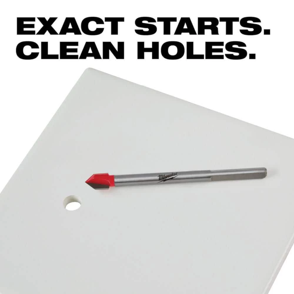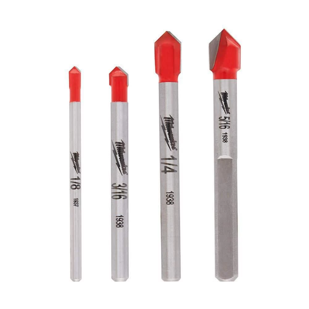 The Milwaukee 4-Piece Glass and Tile Drill Bit features an exact start tip for clean holes and minimal bit walking in glass and ceramic tile. Engineered with sharpened carbide, Milwaukee Glass and Tile Bits provide faster tile drilling than standard glass and tile bits. These bits are designed with a reinforced carbide head for increased durability when high-speed drilling into tile and glass. They’re specifically designed for drilling holes in glass and ceramic tile with drill-drivers only. These drill bits are not recommended for use on porcelain tile. This drill bit set includes one 1/8 in., one 3/16 in., one 1/4 in. and one 5/16 in. glass and tile bits.