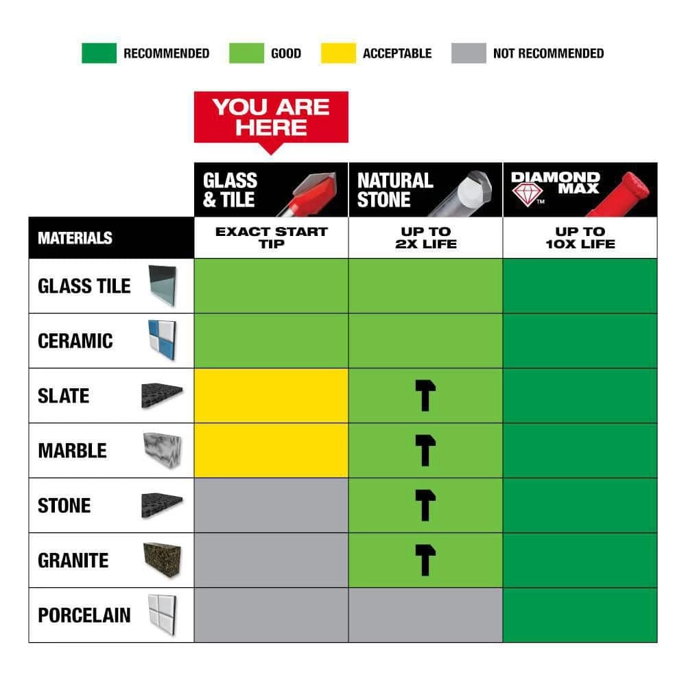 - Sharpened carbide for faster tile drilling