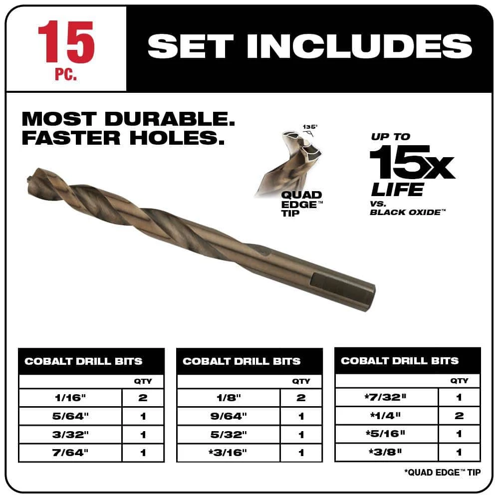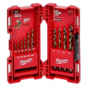 The MILWAUKEE 15 piece Cobalt RED HELIX Drill Bit Kit is engineered for extreme durability and long life in hard metal applications. The drill bits are designed with Variable Helix featuring an aggressive 35 degree Helix Angle ending at 15 degree . This allows for Rapid Chip Removal, limiting heat buildup to stay sharper longer. The 135 degree split point bit tip delivers a precision start and prevents walking for fast, accurate holes. The heavy duty drill bits are ideal for tough applications and provide Up to 10X life vs Black Oxide drill bits. The bit in the kit can be used in all twist drilling applications.