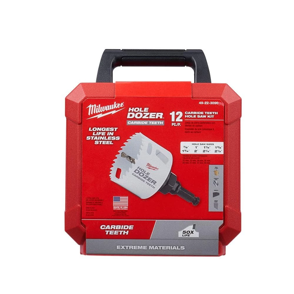 Hole Dozer Carbide Hole Saw Set with SHOCKWAVE IMPACT DUTY Titanium Drill Bit Set (35-Piece). Milwaukee Hole Dozer with Carbide Teeth Hole Saws provide 50X Life in Extreme Multi-Material cutting applications when compared to bi-metal hole saws. The carbide teeth hole saws are built utilizing a tough carbide grade combined with a durable 4 TPI design, yielding the best tooth durability and longest life in Stainless Steel, Abrasive Materials and Fastener Embedded Wood. Cutting depth is 1.62 in., allowing clearance to handle cuts in all materials. The Thermoset Coating reduces friction and drag during cutting, allowing faster cutting and increased cordless efficiency. Plug Jack enhanced user productivity providing best access and leverage to remove material slugs. Hole Dozer Hole Saws with Carbide Teeth are made in USA. Milwaukee SHOCKWAVE Impact Duty Titanium Drill Bits with RED HELIX are engineered for impacts drivers and drills and provide up to 5X life vs. black oxide drill bits. The QUAD EDGE tip delivers a precision start and four cutting edges to create smaller chips for faster removal and less heat leading to longer bit life. The bits also feature an internal ENHANCED TAPERED WEB that greatly increases their strength, reducing premature breakage.