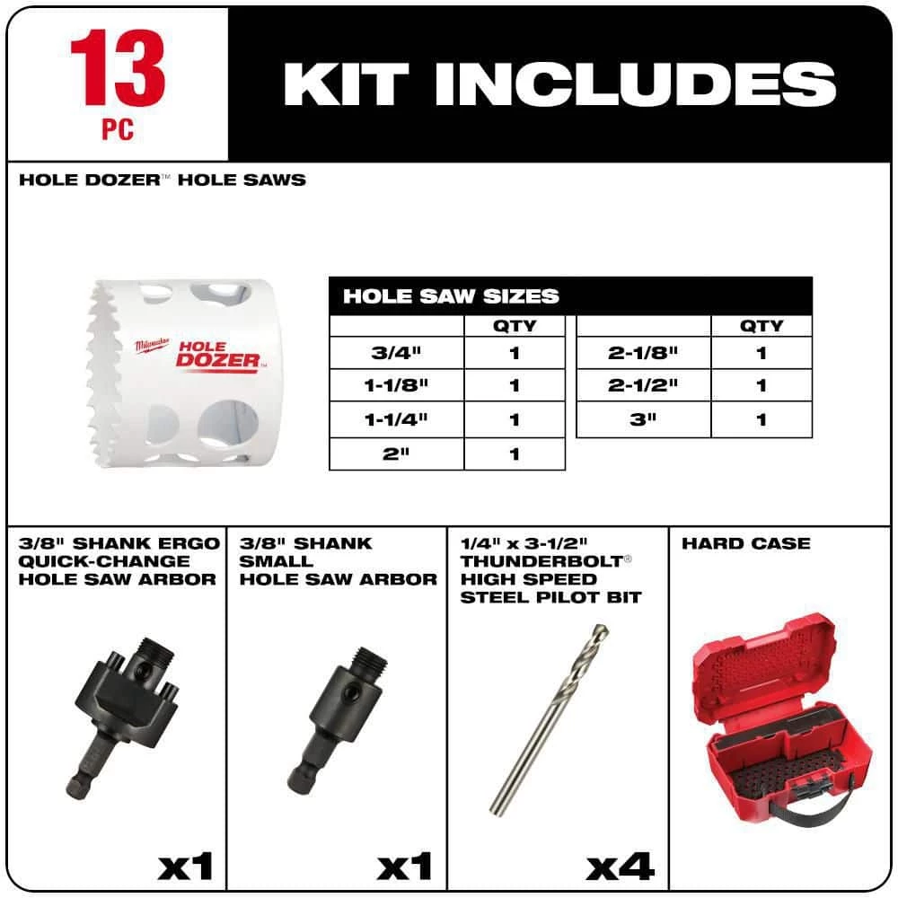 Our 13-Piece HOLE DOZER Bi-Metal Hole Saw Kit features a new 3.5 TPI tooth design that delivers you the longest life in metal applications. These Bi-Metal Hole Saws feature the industry’s only Lifetime Tooth Break Warranty and take on all general purpose applications, making them the most durable hole saws on the market. Milwaukee ALL-ACCESS SLOTS solve the frustration of plug removal, making you more productive with less downtime between holes. The new slot design also provides you with increased pilot visibility for accurate placement and faster chip ejection keeping their cuts cool. The HOLE DOZER Thermoset Coating allows for faster cutting and is optimized for cordless tools, delivering you 25% more holes per charge. The HOLE DOZER Bi-Metal hole saws are proudly made in the USA.
