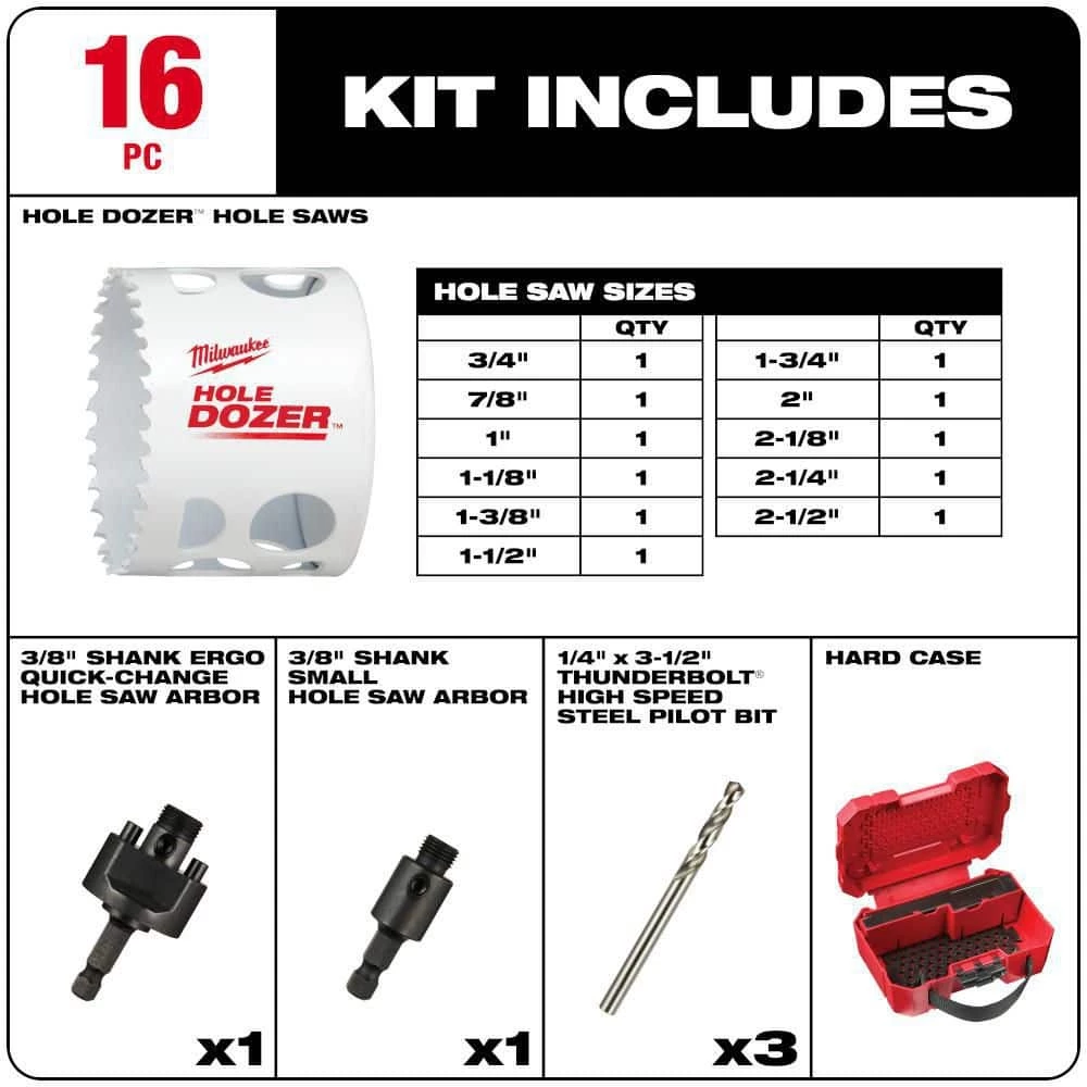 - Includes: (1) 3/4″ HOLE DOZER Bi-Metal Hole Saw (49-56-9605), (1) 7/8″ HOLE DOZER Bi-Metal Hole Saw (49-56-9607), (1) 1″ HOLE DOZER Bi-Metal Hole Saw (49-56-9609) , (1) 1-1/8″ HOLE DOZER Bi-Metal Hole Saw (49-56-9611), (1) 1-3/8″ HOLE DOZER Bi-Metal Hole Saw (49-56-9615), (1) 1-1/2″ HOLE DOZER Bi-Metal Hole Saw (49-56-9617), (1) 1-3/4″ HOLE DOZER Bi-Metal Hole Saw (49-56-9621), (1) 2″ HOLE DOZER Bi-Metal Hole Saw (49-56-9624), (1) 2-1/8″ HOLE DOZER Bi-Metal Hole Saw (49-56-9626), (1) 2-1/4″ HOLE DOZER Bi-Metal Hole Saw (49-56-9628), (1) 2-1/2″ HOLE DOZER Bi-Metal Hole Saw (49-56-9631), (1) Small Thread Arbor (49-56-7010), (1) Large Thread Arbor (49-56-7250), (3) Pilot Bit (49-56-8010)