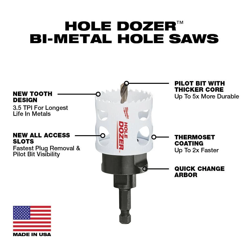 - Includes: (2) 1 in. HOLE DOZER bi-metal hole saw, (2) 1-1/8 in. HOLE DOZER bi-metal hole saw, (2) 1-1/2 in. HOLE DOZER bi-metal hole saw, (2) 2 in. HOLE DOZER bi-metal hole saw, (2) 2-3/4 in. HOLE DOZER bi-metal hole saw, (2) large thread arbor, (2) small thread arbor, (6) pilot bits