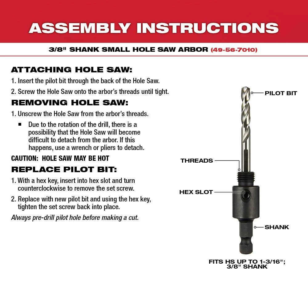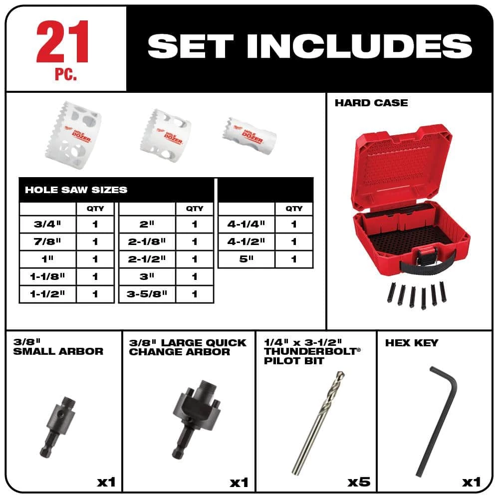 - 49-22-4171 Includes: (1) 3/4 in. Hole Dozer Bi-Metal Hole Saw, (1) 7/8 in. Hole Dozer Bi-Metal Hole Saw, (1) 1 in. Hole Dozer Bi-Metal Hole Saw, (1) 1-1/8 in. Hole Dozer Bi-Metal Hole Saw, (1) 1-1/2 in. Hole Dozer Bi-Metal Hole Saw, (1) 2 in. Hole Dozer Bi-Metal Hole Saw, (1) 2-1/8 in. Hole Dozer Bi-Metal Hole Saw, (1) 2-1/2 in. Hole Dozer Bi-Metal Hole Saw, (1) 3 in. Hole Dozer Bi-Metal Hole Saw, (1) 3-5/8 in. Hole Dozer Bi-Metal Hole Saw, (1) 4-1/4 in. Hole Dozer Bi-Metal Hole Saw, (1) 4-1/2 in. Hole Dozer Bi-Metal Hole Saw, (1) 5 in. Hole Dozer Bi-Metal Hole Saw, (1) 3/8 in. Hex Shank Arbor, (1) 3/8 in. Large Quick-Change Arbor, (5) 3-1/2 in. Pilot Bits