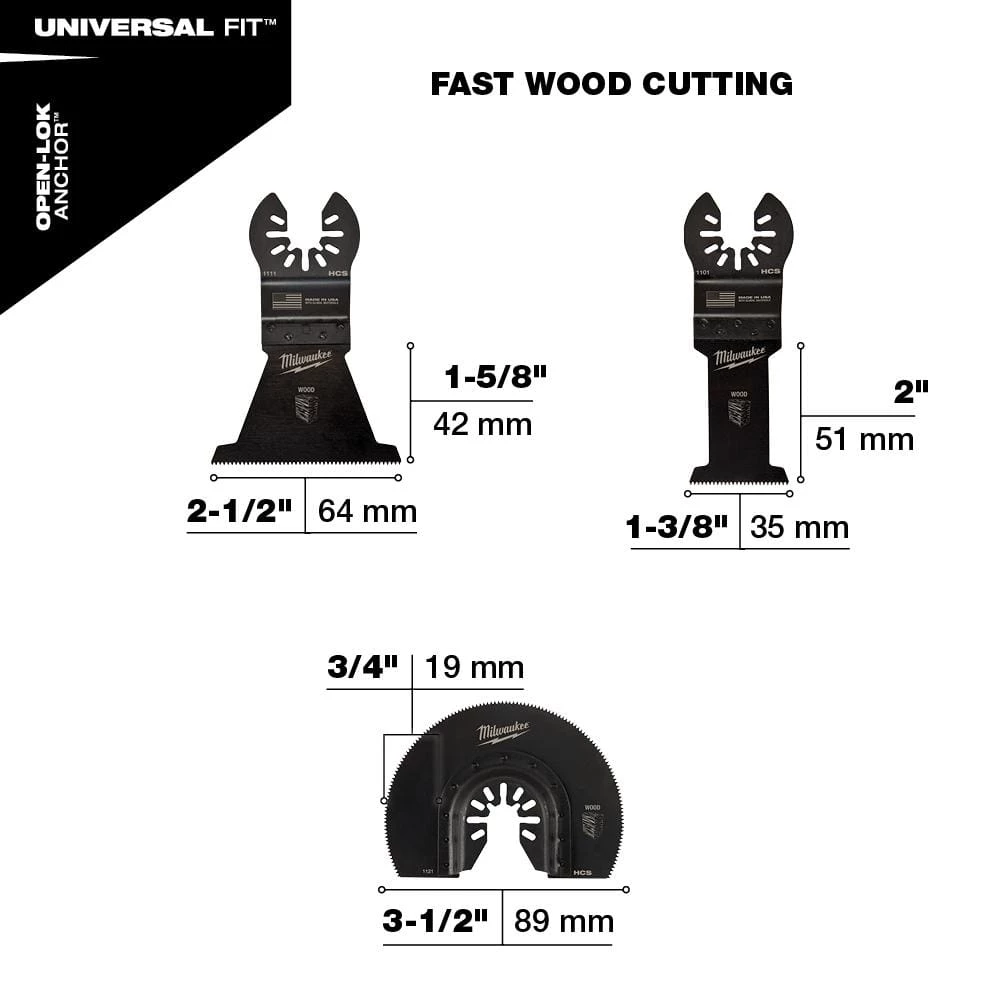 - Includes: one 49-22-4025 with 9 hole saw sizes: 3/4 in., 7/8 in., 1-1/8 in., 1-3/8 in., 1-1/2 in., 1-3/4 in., 2 in., 2-1/8 in. and 2-1/2 in., 2 arbors, 2 total pilot bits, hex key and case, one 49-22-0175 8-pieces high speed wood spade bit set with 3/8 in., 1/2 in., 5/8 in., 3/4 in., 7/8 in., 1 in. and 1-1/8 in. bits plus a 6 in. QUIK-LOK extension in a carrying case, one 49-10-9004 3-pieces, oscillating multi-tool blade wood cutting kit with one 1-3/8 in. HCS wood blade, one 2-1/2 in. HCS wood blade, one 3-1/2 in. HCS segmented wood blade