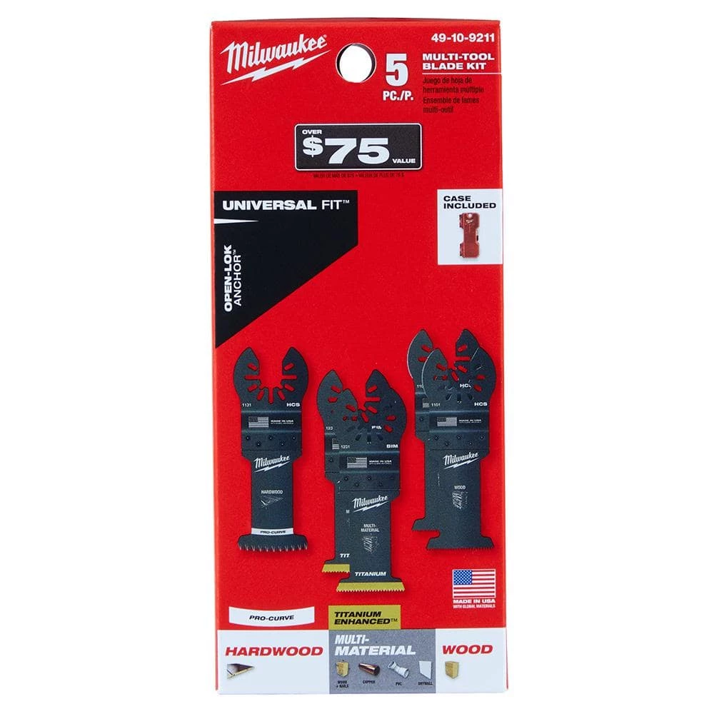 The Milwaukee Universal Fit OPEN-LOK 5-Piece Oscillating Multi-Tool Blade Kit offers users an assortment of some of the most frequently used oscillating blades. The included Titanium Enhanced Bi-Metal Blades use premium high-speed steel and last up to 15X longer than standard high carbon steel (HCS) blades. The bi-metal blade is ideal for smooth cuts in wood and nails, PVC and drywall. The Triple Ground Japanese Tooth Blade delivers users up to 2X faster cuts than the previous Milwaukee HCS Blade and features a PRO-CURVE cutting edge for greater control. These multi-tool blades are ideal for fast, clean cuts in hardwood and can also be used in other woods, PVC and drywall. The oscillating wood blades have been designed with aggressive, precision ground teeth for fast cuts in wood, drywall and PVC. This oscillating tool blade kit is designed with global materials and includes a storage case.