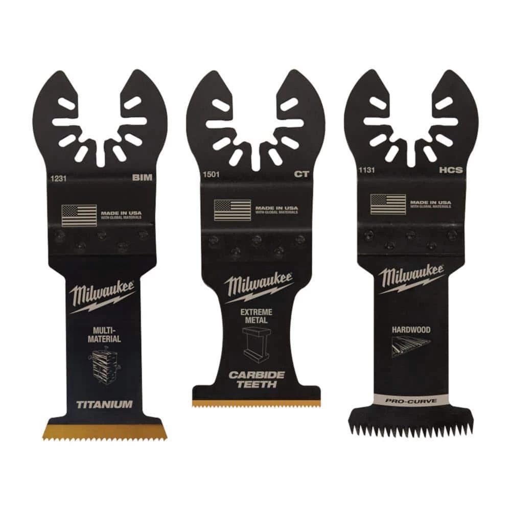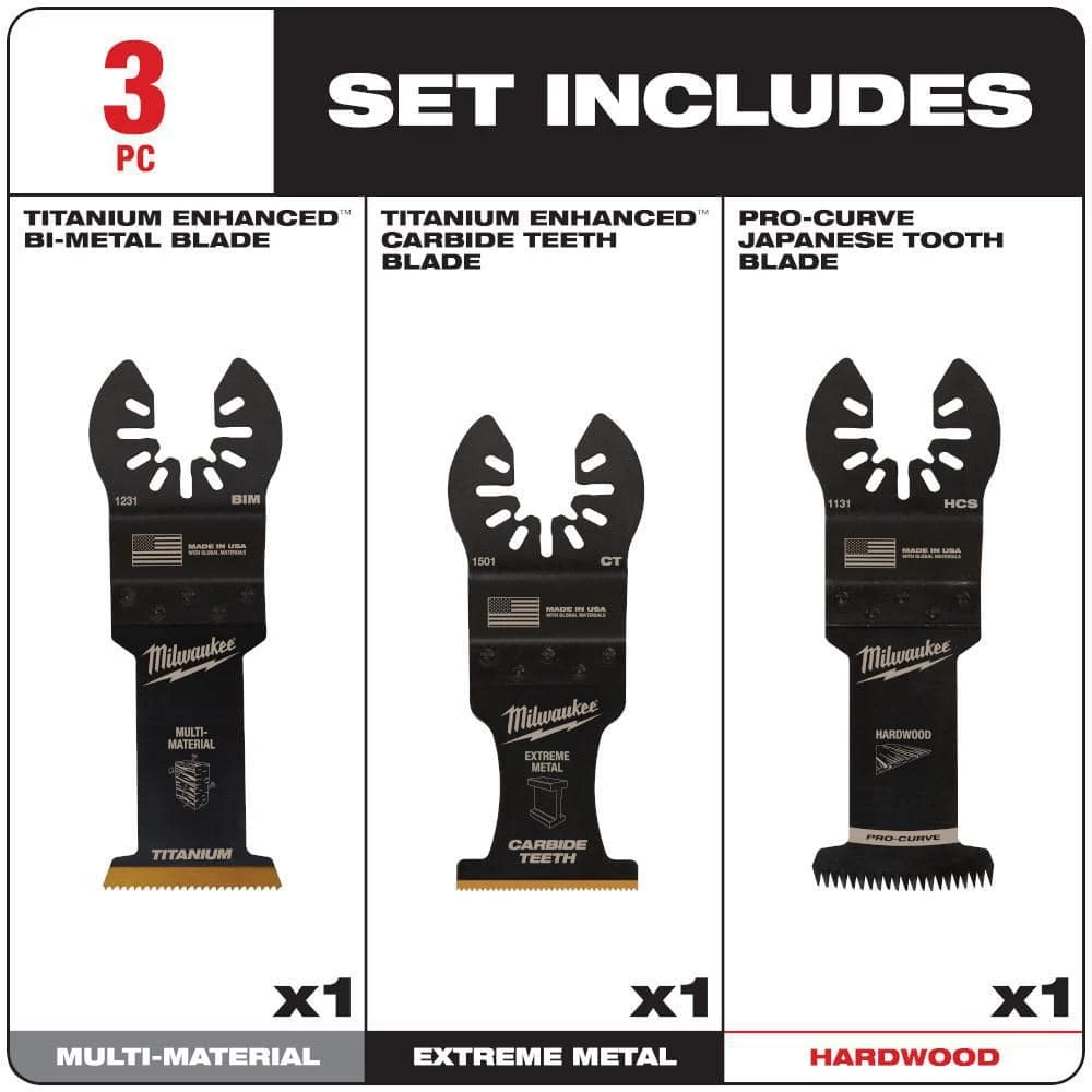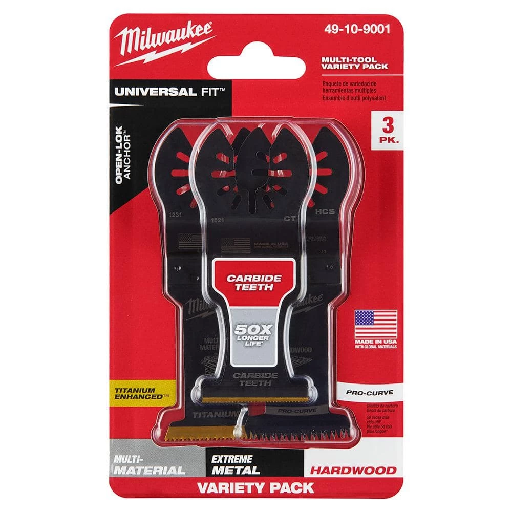 The Milwaukee Universal Fit OPEN-LOK 3-Piece Oscillating Multi-Tool All-Purpose Variety Pack provides users with an assortment of top-performing blades in the three most common cutting applications: metal, wood & nails, and hardwood. The included Titanium Enhanced Carbide Teeth Blade is designed to last up to 50X longer in extreme metals compared to standard bi-metal blades. The Carbide Teeth are ideal for users cutting screws, bolts, metal pipe, nails, and more. The Titanium Enhanced Bi-Metal blade uses premium high-speed steel and lasts up to 15X longer than standard high carbon steel (HCS) blades. The bi-metal multi-tool blade is ideal for smooth cuts in wood with nails, PVC, and drywall. The Triple Ground Japanese Tooth Blade delivers up to 2X faster cuts than the previous Milwaukee HCS blade and features a PRO-CURVE cutting edge for greater control. Ideal for fast, clean cuts in hardwood and can also be used in other woods, PVC, and drywall. This oscillating tool blade variety pack is designed with global materials.