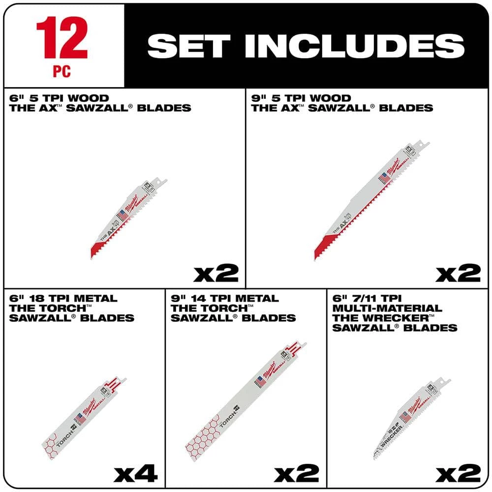 - Includes: four 6 in. 18 TPI the torch blades, two 6 in. 8 TPI the wrecker blades, two 6 in. 5/8 TPI the ax blades, two 9 in. 5/8 TPI the ax blades, two 9 in. 14 TPI the torch blades and 1 storage container