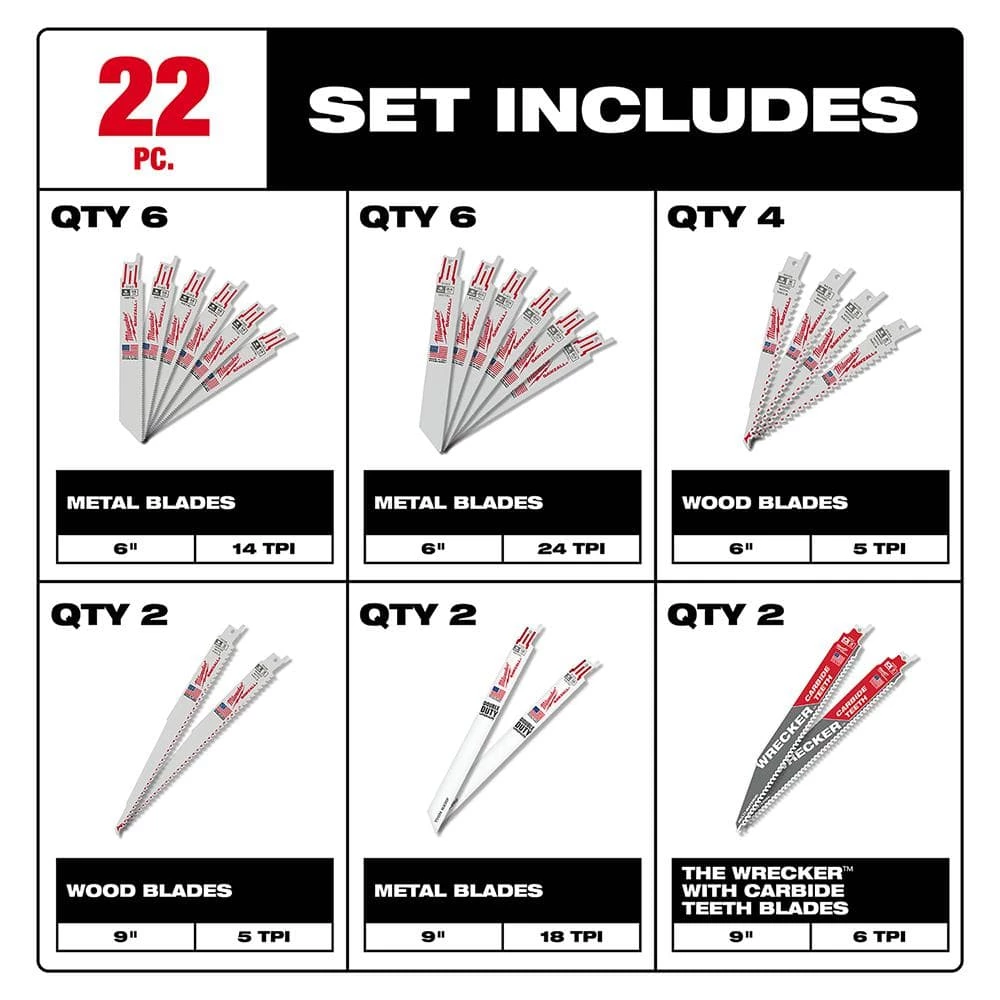 - SAWZALL blades included: six 6 in. 14 TPI metal THE TORCH SAWZALL blades, six 6 in. 24 TPI metal SAWZALL blades, 4 6-in. 5 TPI SAWZALL blades, 2 9 in. 18 TPI metal THE TORCH SAWZALL blade and 2 9 in. 5 TPI wood THE AX SAWZALL blades and 2 free 9 in. carbide wrecker SAWZALL blade