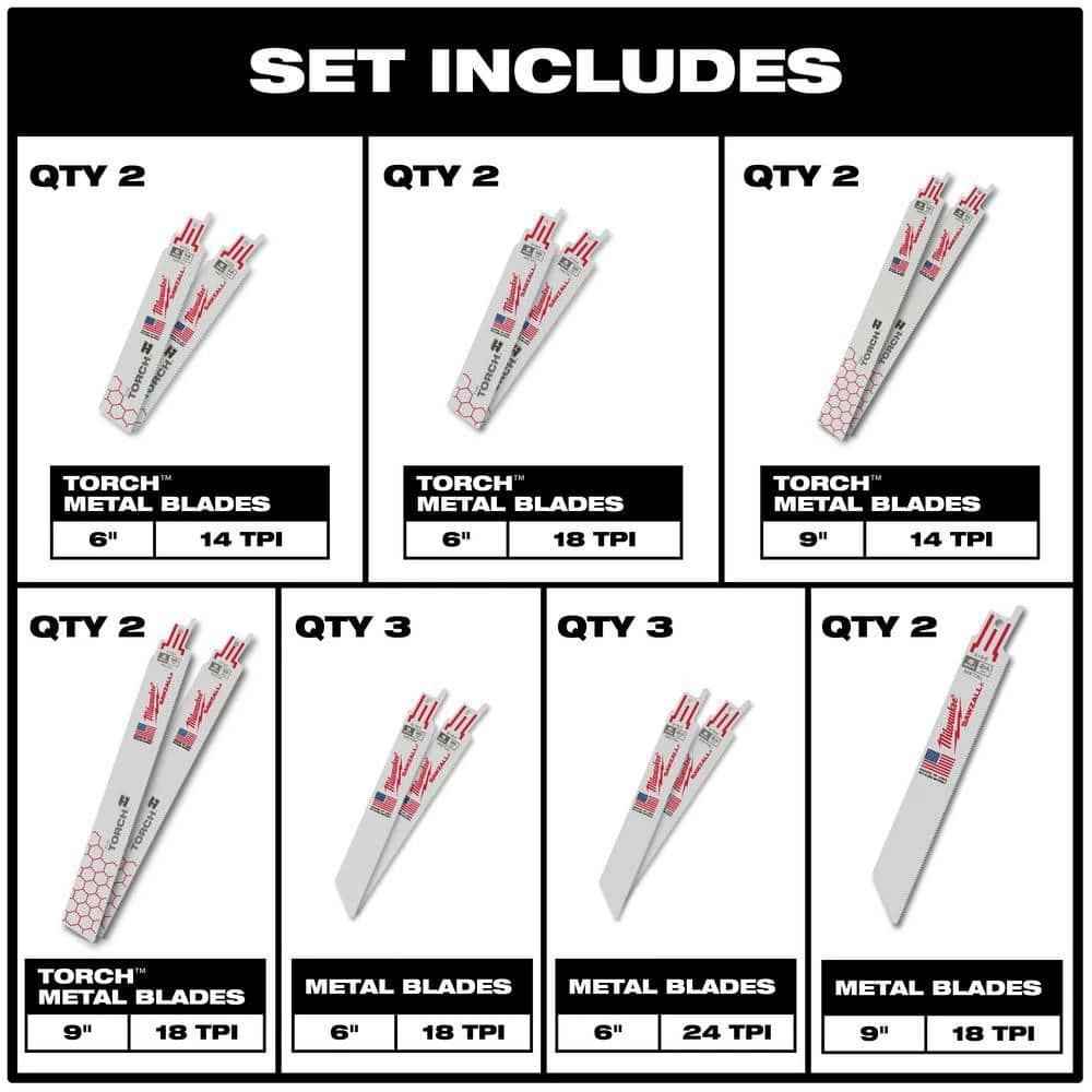 - Kit includes: one 49-22-1110 SAWZALL wood and metal cutting bi-metal reciprocating saw blade set (10-piece) and one 49-22-1216 SAWZALL metal cutting bi-metal reciprocating blade set (16-piece)