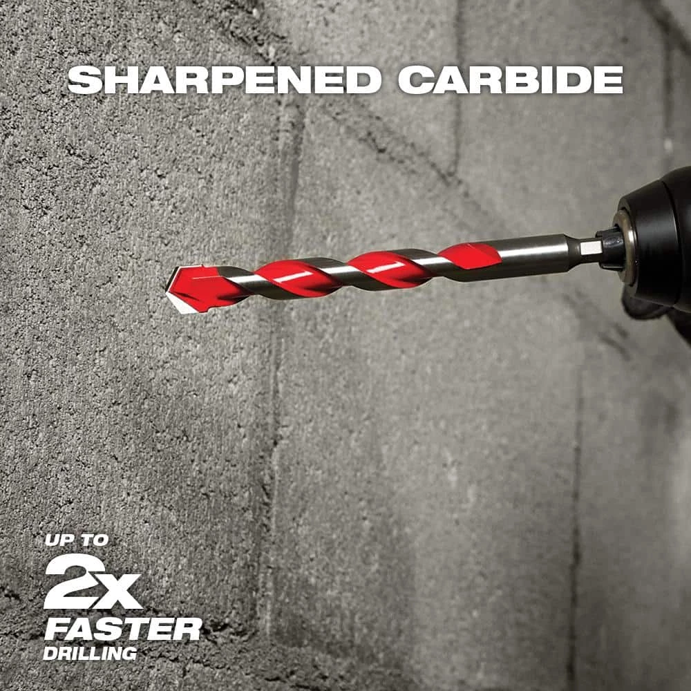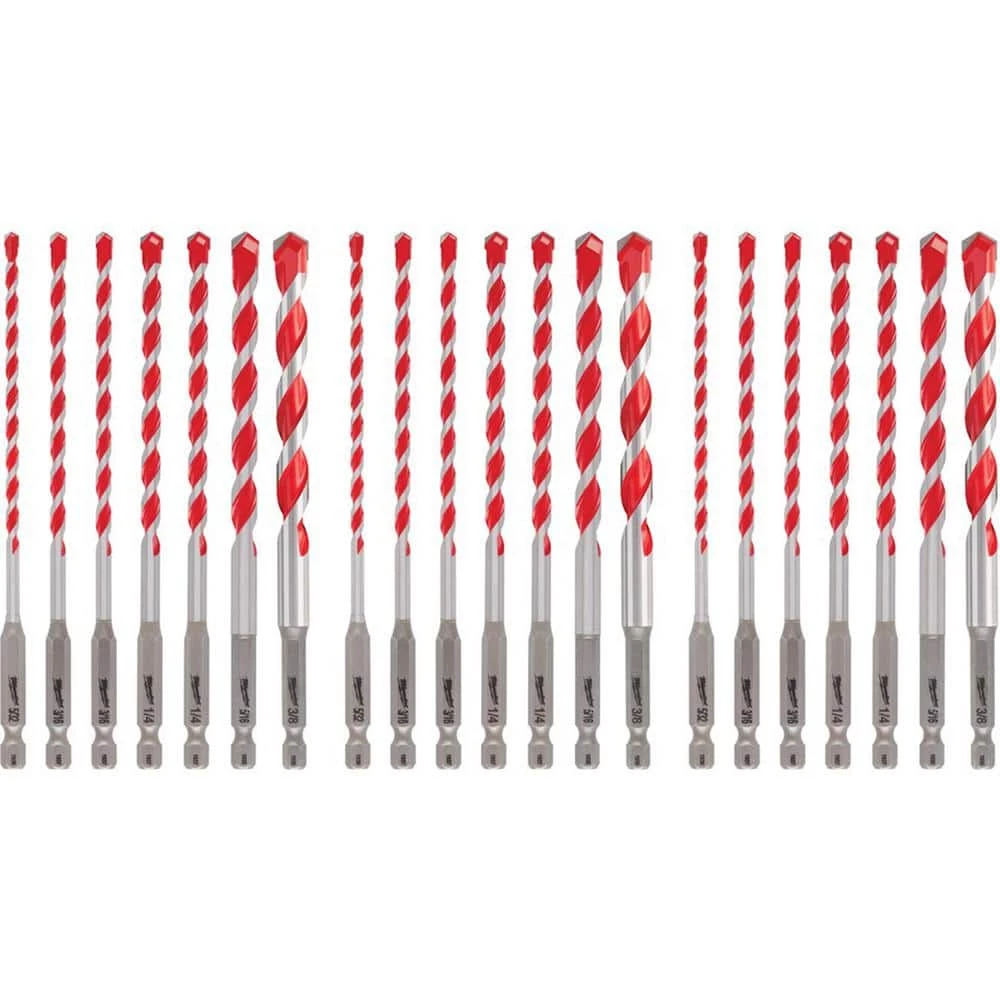 The Milwaukee 21-Piece SHOCKWAVE Carbide Hammer Drill Bit Kit uses sharpened carbide to deliver up to 5 x longer life in concrete and up to 2 x faster drilling into masonry materials. Engineered with a precision ground tip, these bits deliver faster starts and less walking in concrete, brick and block. The wide flutes allow for fast dust removal. Equipped with a 1/4 in. Hex Shank, Milwaukee SHOCKWAVE Carbide Hammer Drill Bits are the ideal solution for drilling in masonry materials with both impacts and hammer drills/drivers.
