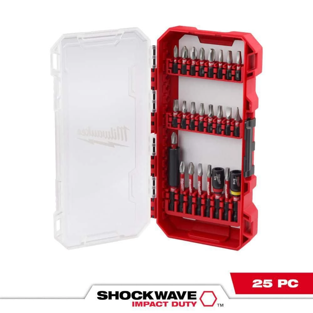 The MILWAUKEE 25-Piece SHOCKWAVE Impact Duty Driver Bit Set is engineered to offer you the Most Durable, Best Fitting driver bits in the market. This comprehensive impact driver bit set offers solutions for a wide range of drilling, driving, and fastening applications. The Milwaukee bits feature Wear Guard Tip for increased wear resistance, which protects the fit over the life of the bit. The impact driver bits have an optimized Shockzone for each tip type and length to absorb peak torque and prevent breaking. The Custom Alloy76 Steel is customized and heat treated per tip type to extend the life of the driver bit up to 50X vs. competitive impact driver bits. The MILWAUKEE SHOCKWAVE Impact Duty Driver Bits are built to deliver extreme durability in the most demanding applications.