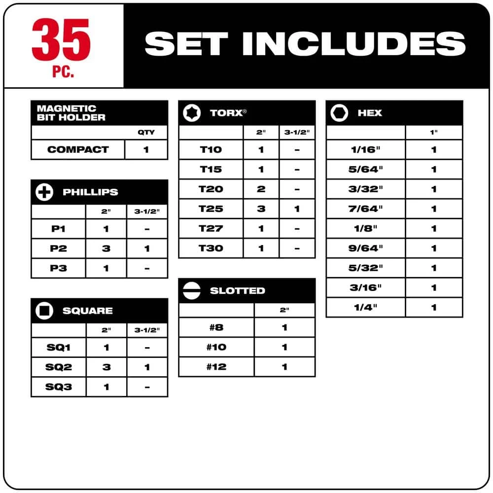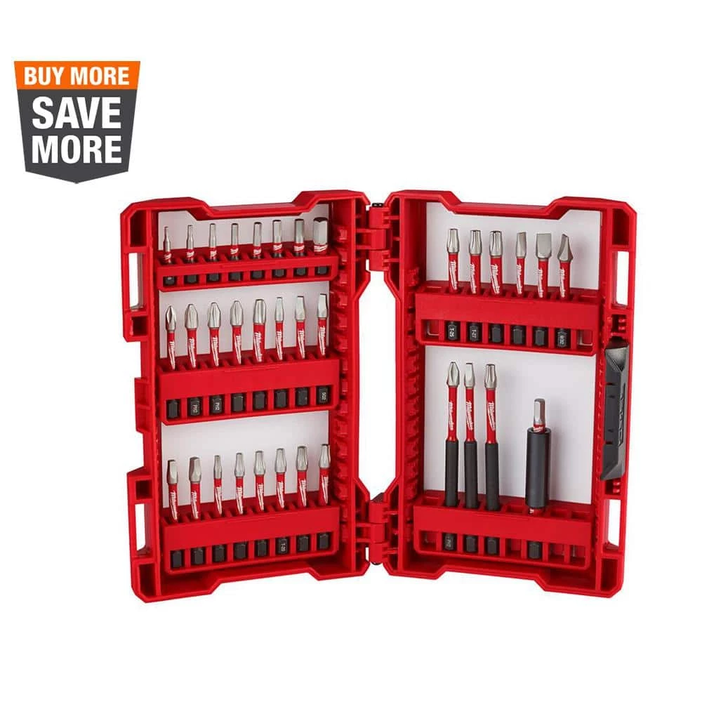 The MILWAUKEE SHOCKWAVE 35-Piece Impact Duty Bit Set is engineered to be the most durable, best fitting driver bits on the market. The SHOCKWAVE bits Wear Guard Tip for increased wear resistance, which protects the fit over the life of the bit. The impact driver bits have an optimized Shockzone for each tip type and length of driver bit to absorb peak torque and prevent breaking. The Custom Alloy76 Steel is customized and heat treated per tip type to extend the life of the driver but by up to 50X vs. competitive impact driver bits. The MILWAUKEE SHOCKWAVE Impact Duty driver bits are built to deliver users extreme durability for the most demanding applications.