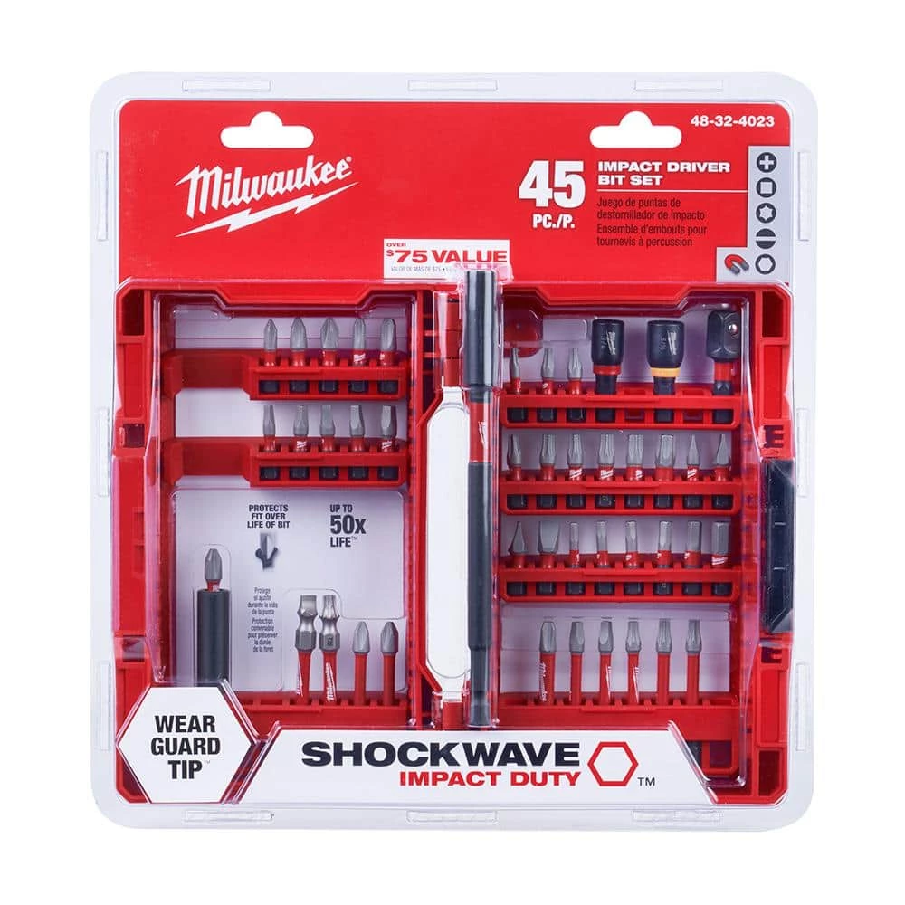 The Milwaukee Shockwave 45pc Impact Driver Bit Set is engineered to be the Most Durable, Best Fitting driver bits on the market. The Wear Guard Tip delivers increased wear resistance which protects the impact bit’s fit over the life of the bit. The Shockzone is optimized for each tip type and length of driver bit in the set to absorb peak torque and prevent breaking. The driver bits have Custom Alloy76 for a customized steel and heat treatment per tip type to extend the life of the user’s driver bits, providing up to 50X life versus other impact driver bits on the market. The Milwaukee Shockwave driver bits are built to provide users with extreme durability for the most demanding applications.