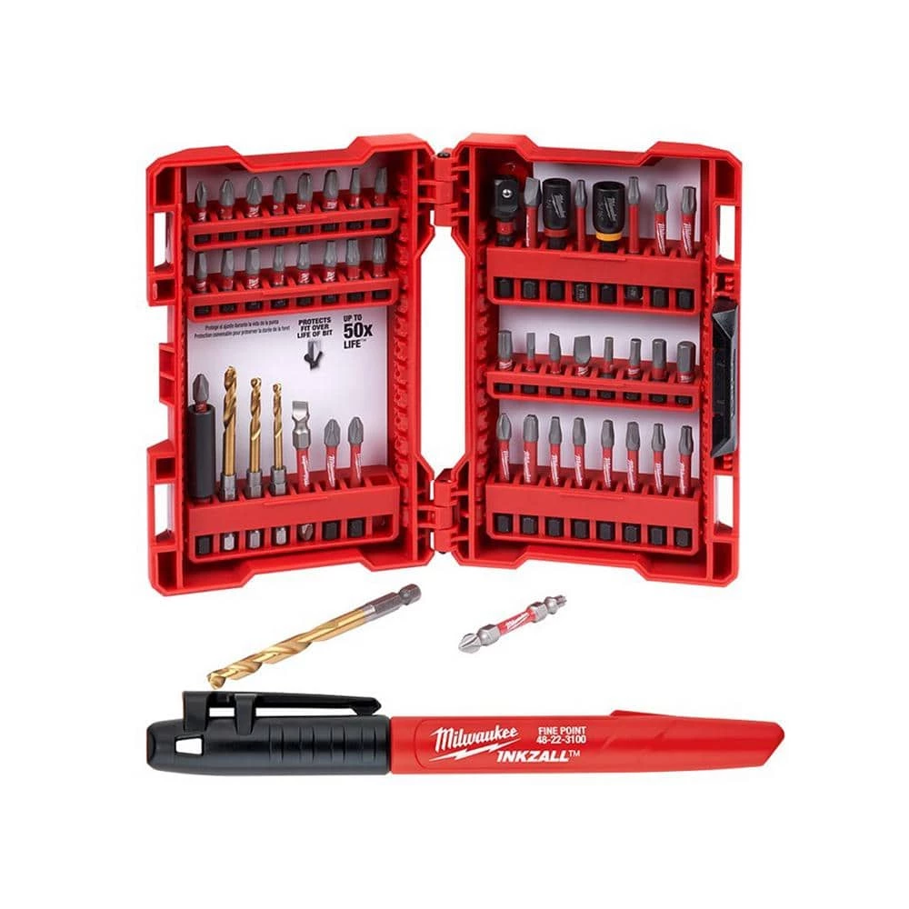 - 48-32-4024 SHOCKWAVE impact driver bit set (50-piece) includes: 1 compact magnetic bit holder, one 1/4 in. nut driver, one 5/16 in. nut driver, one 3/8 in. socket adapter, 2 double ended power bits, 1 PH1 insert bit, 3 PH2 insert bits, 1 PR2 insert bit, 2 PH3 insert bits, 1 SQ1 insert bit, 3 SQ2 insert bits, 1 SQ3 insert bit, 1 T15 insert bit, 2 T20 insert bits, 2 T25 insert bits, 1 T30 insert bit, 1 slotted #6 insert bit, 1 slotted #8 insert bit, 1 slotted #10 insert bit, one 1/8 in. hex insert bit, one 5/32 in. hex insert bit, one 3/16 in. hex insert bit, one 1/4 in. hex insert bit, 3 PH2 power bits, 1 PH3 power bit, 3 SQ2 power bits, 1 SQ3 power bit, 1 T15 power bit, 2 T20 power bits, 2 T25 power bits, 1 T30 power bit, 1 slotted #10 power bit, titanium RED HELIX bits: 1/8 in., 5/32 in., 3/16 in and 1/4 in.