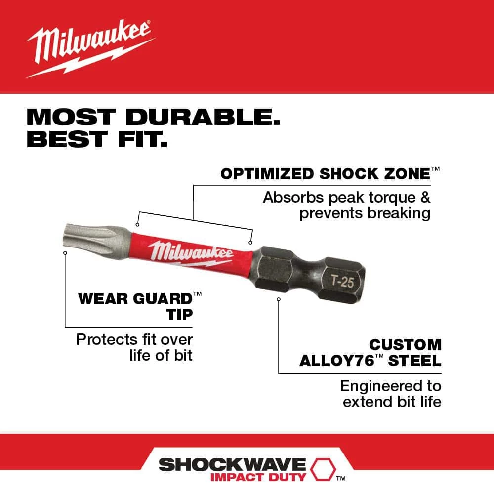 Shockwave Impact Driver Bits are engineered to be the Most Durable, Best Fitting driver bits on the market. The Wear Guard Tip delivers increased wear resistance which protects the fit over the life of the bit. The Shockzone is optimized for each tip type and length of driver bit to absorb peak torque and prevent breaking. The Custom Alloy76 has a customized steel and heat treatment per tip type to extend the life of the driver bits, providing up to 50X life versus competitive impact driver bits. Shockwave driver bits are built to deliver extreme durability for the most demanding applications.