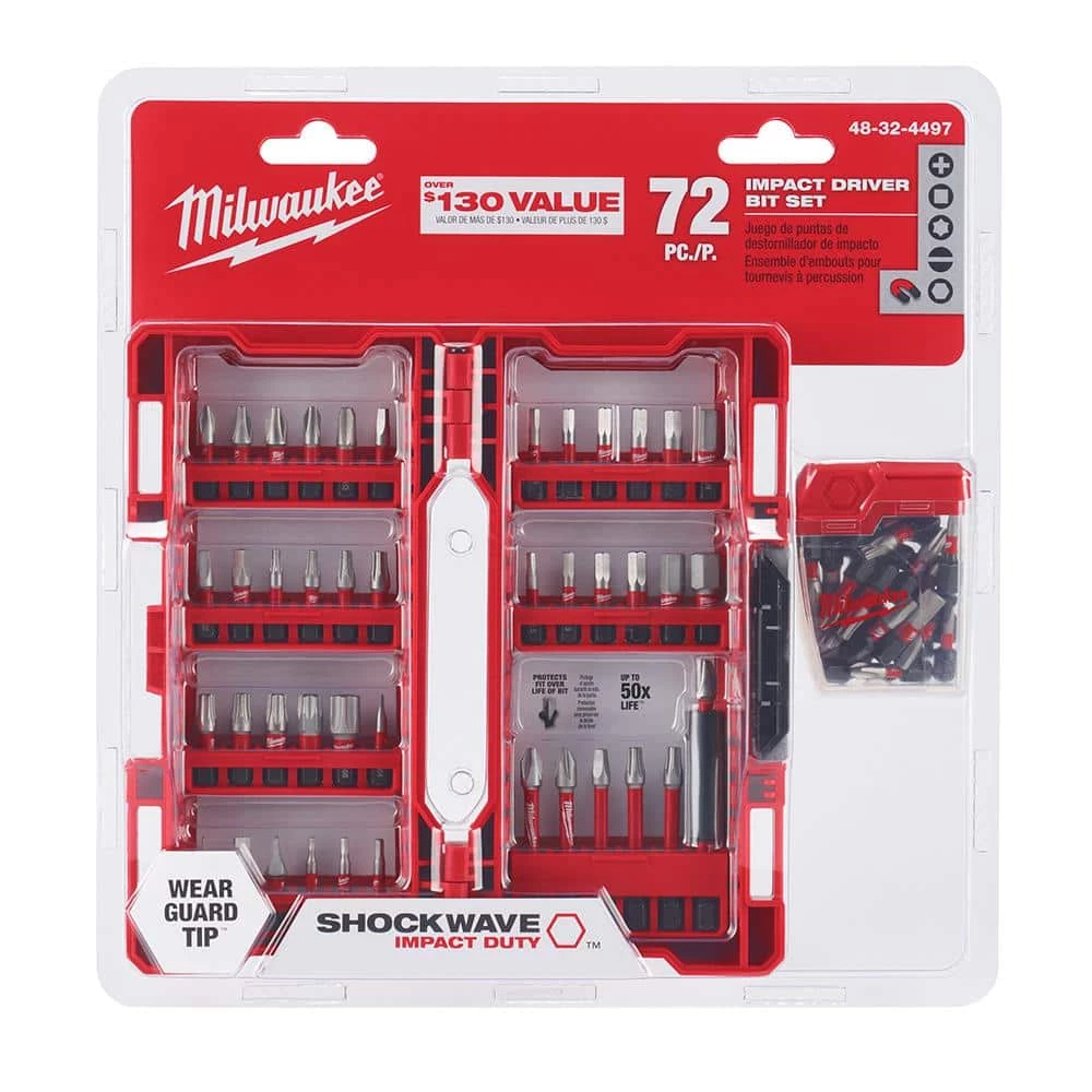 - Includes: (2) 1 in. P1, (7) 1 in. P2, (2) 1 in. P2R, (2) 1 in. P3, (2) 1 in. SQ1, (4) 1 in. SQ2, (2) 1 in. SQ3, (1) 1 in. T10, (1) 1 in. T15, (2) 1 in. T20, (2) 1 in. T25, (1) 1 in. T27, (2) 1 in. T30, (1) 1 in. T40, (2) 1 in. T50, (2) 1 in. SL #4, (1) 1 in. SL #6, (1) 1 in. SL #8, (2) 1 in. SL #10, (2) 1 in. Hex 1/16 in., (2) 1 in. Hex 5/16 in., (2) 1 in. Hex 3/32 in., (2) 1 in. Hex 7/64 in., (2) 1 in. Hex 1/8 in., (2) 1 in. Hex 9/64 in., (2) 1 in. Hex 5/32 in., (2) 1 in. Hex 3/16 in., (2) 1 in. Hex 1/4 in., (2) 1 in. Hex 2.5MM, (2) 1 in. Hex 3MM, (2) 1 in. Hex 4MM, (2) 1 in. Hex 5MM, (2) 1 in. Hex 6MM, (2) 2 in. P2, (1) 2 in. SQ2, (1) 2 in. SQ3, (3) 2 in. T25, (1) Compact (2.36 in.) bit holder and a Right Angle Drill/Driver Adapter