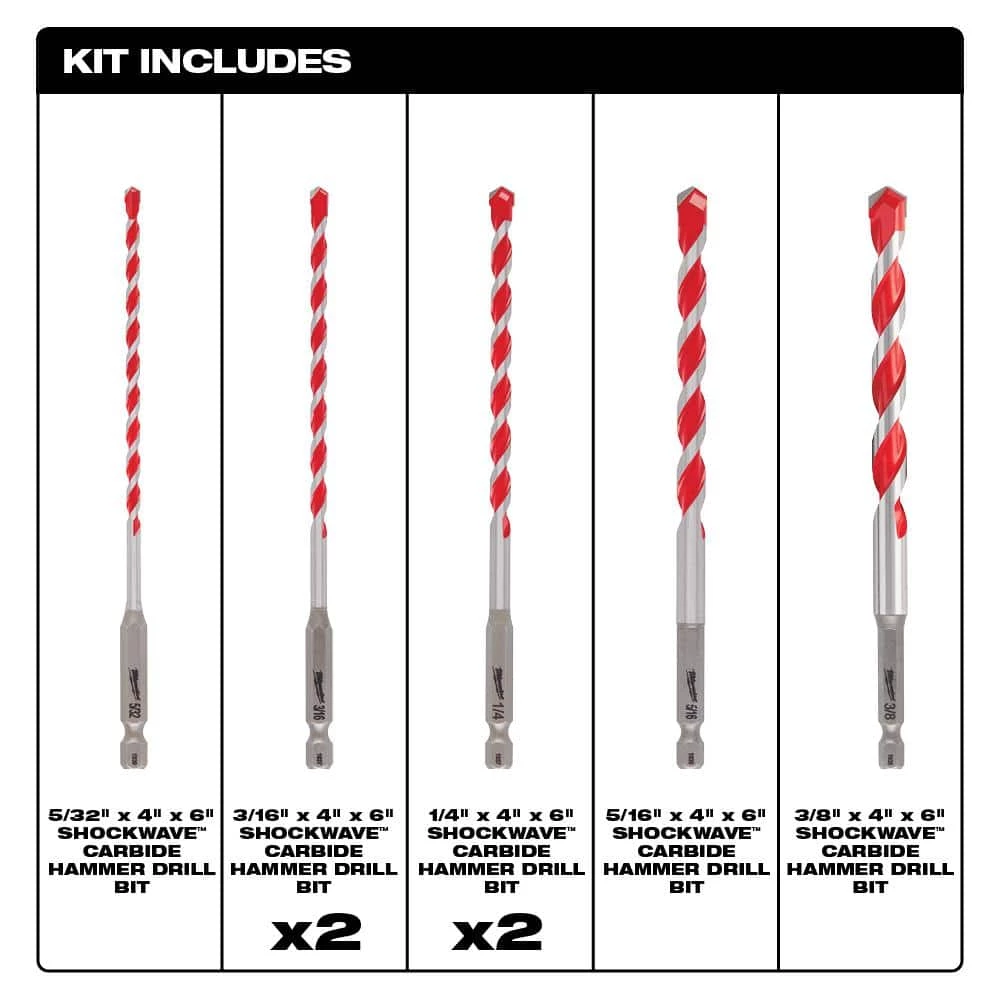The Milwaukee Shockwave 45-piece Impact Driver Bit Set is engineered to be the Most Durable, Best Fitting driver bits on the market. The Wear Guard Tip delivers increased wear resistance which protects the impact bit’s fit over the life of the bit. The Shockzone is optimized for each tip type and length of driver bit in the set to absorb peak torque and prevent breaking. The driver bits have Custom Alloy76 for a customized steel and heat treatment per tip type to extend the life of the user’s driver bits, providing up to 50X life versus other impact driver bits on the market. The Milwaukee Shockwave driver bits are built to provide users with extreme durability for the most demanding applications. The Milwaukee 7-Piece SHOCKWAVE Carbide Hammer Drill Bit Kit uses sharpened carbide to deliver up to 5x longer life in concrete and up to 2x faster drilling into masonry materials. Engineered with a precision ground tip, these bits deliver faster starts and less walking in concrete, brick and block. The wide flutes allow for fast dust removal. Equipped with a 1/4 in. Hex Shank, Milwaukee SHOCKWAVE Carbide Hammer Drill Bits are the ideal solution for drilling in masonry materials with both impacts and hammer drills/drivers. This drill bit kit includes one 5/32 in., two 3/16 in., two 1/4 in., one 5/16 in. and one 3/8 in. hammer drill bits.
