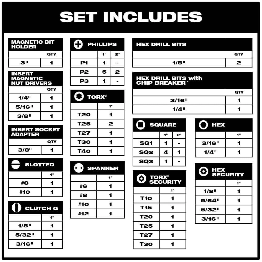- Includes: 3″ Magnetic Bit Holder; (40) 1″ Insert Bits: P1, (5) P2, P3, SQ1, (4) SQ2, SQ3, T20, (2) T25, T27, T30, T40, SL3/16″, SL1/4″, 3/16″ Hex, 1/4″ Hex, T10 Security, T15 Security, T20 Security, T25 Security, T27 Security, T30 Security, 1/8″ Hex Security, 9/64″ Hex Security, 5/32″ Hex Security, 3/16″ Hex Security, #6 Spanner, #8 Spanner, #10 Spanner, #12 Spanner, 1/8″ Clutch G, 5/32″ Clutch G, 3/16″ Clutch G