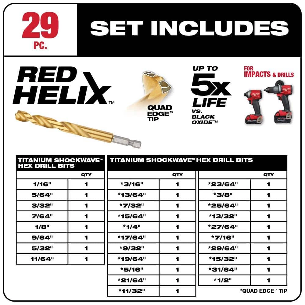 The MILWAUKEE 29 Piece SHOCKWAVE RED HELIX Titanium Drill Bit Set is engineered for extreme durability and long life. The QUAD EDGE tip delivers a precision start and four cutting edges to create smaller chips for faster removal and less heat leading to longer bit life. Designed with a Variable Helix that includes an aggressive 35 degree helical angle, which ends at 15 degree , these tapered drill bits with RED HELIX provide Rapid Chip Removal limiting heat buildup to Stay Sharper Longer. The bits also feature an internal ENHANCED TAPERED WEB that greatly increases their strength, reducing premature breakage. Ideal for various applications including but not limited to wood, plastics, and metals, Milwaukee Red Helix Titanium Drill Bits provide up to 5X life vs. black oxide drill bits.