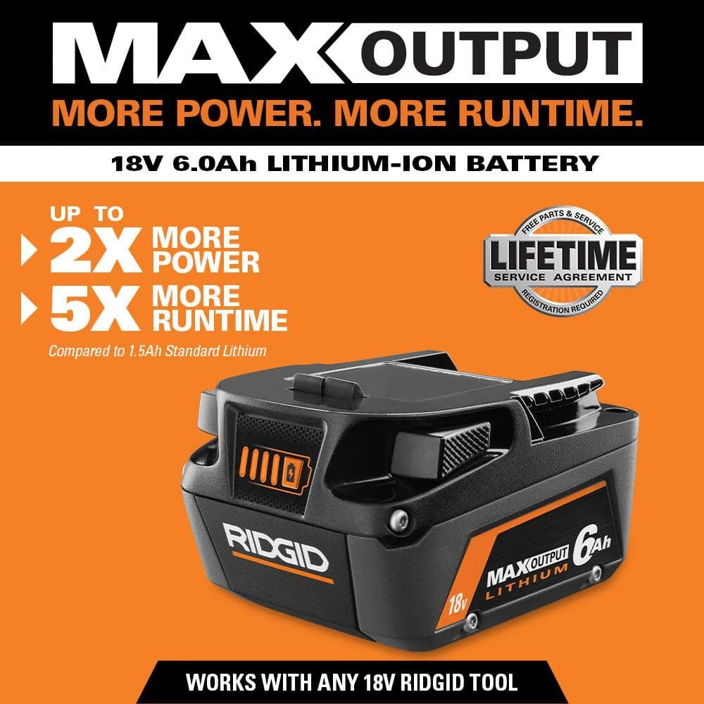 RIDGID introduces the AC840060 18V MAX Output 6.0 Ah Lithium-Ion Battery (2-Pack). MAX Output batteries facilitate battery and tool communication unleashing the full potential of any RIDGID 18V Brushless Tool providing more power and more runtime. The RIDGID 6.0 Ah MAX Output batteries will provide up to 5X more runtime compared to the 1.5 Ah lithium-ion battery (R870015). Along with improved performance, these batteries are also 23% more compact than the previous model (R8400806). The Advanced Intelligent Electronics in MAX Output batteries enable users to power through the most demanding applications on the jobsite. RIDGIDs internal design is specifically engineered to prolong battery life by protecting the battery cells from extreme jobsite conditions. The durable pack design is constructed to endure the toughest demands. As always, this RIDGID 6.0 Ah MAX Output batteries are 100% compatible with all RIDGID 18V tools. Best of all, these batteries are eligible for the Industry’s Best Lifetime Service Agreement, simply register within 90 days of purchase for FREE Parts, FREE Service, For LIFE. Charger sold separately.