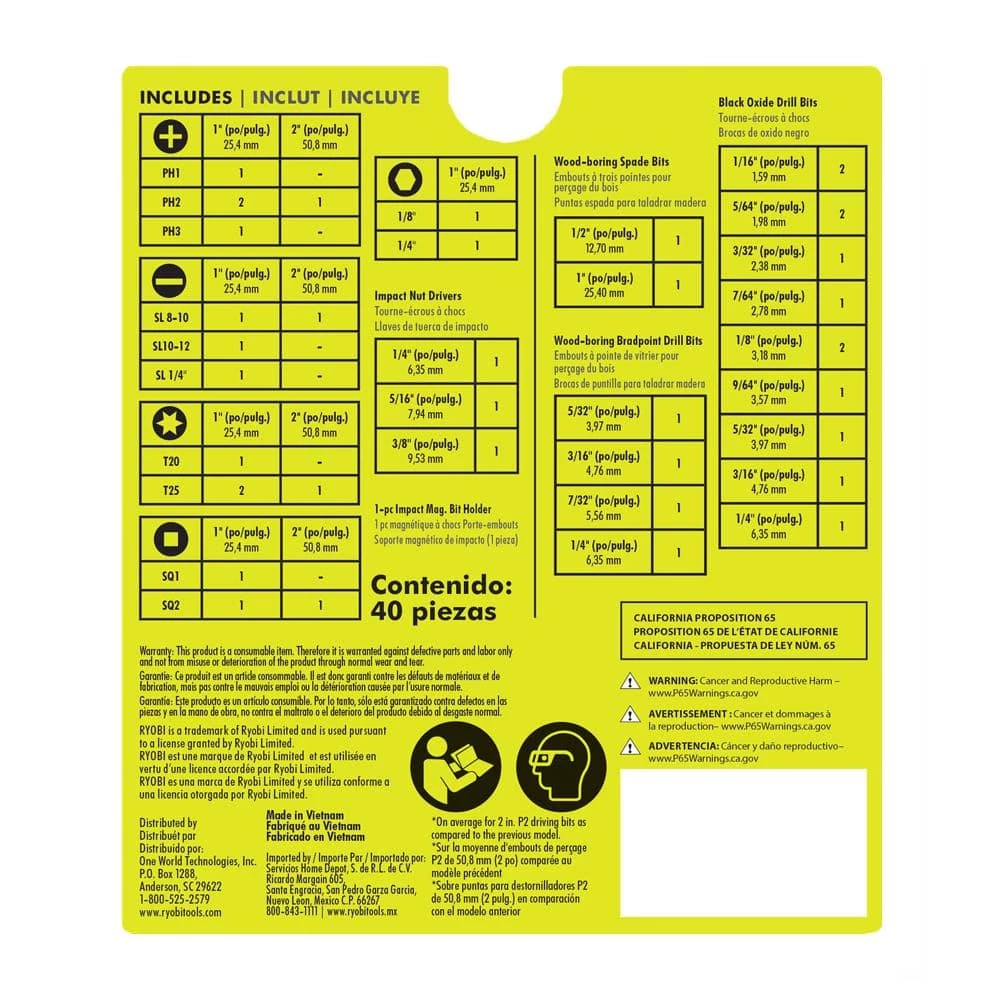 RYOBI Introduces the Black Oxide Drill and Drive Kit (40-Piece). This 40-Piece Drill and Drive set is a great kit for projects including wood, metal, and plastic materials. The Black Oxide bits are constructed out of high-speed steel with a black oxide finish to offer superior durability. Another key detail of these bits is the 135° split point that prevents your bit from walking and ensures drilling on contact. This kit features bits containing a TORSION ZONE that is engineered to absorb the high torque and demand that comes with the use of an impact driver for 3X longer life. This kit contains a variety of the most commonly used 1 in. and 2 in. bits, nut drivers that have excellent holding power when using hex drive fasteners and a magnetic bit holder for increased convenience. Included in this set are Woodboring Spade Bits that provide up to 1 in. wood drilling capacity for a wide array of applications. The compact case adds effortless storage and mobility. This set includes (12) black oxide drill bits, (2) woodboring spade bit, (4) bradpoint drill bits, (14) 1 in. impact driver bit, (4) 2 in. impact driver bit, (3) impact nut drivers, (1) impact magnetic bit holder, and a clear front carrying case.