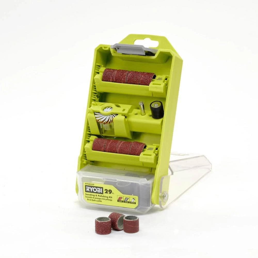RYOBI introduces the Rotary Tool 29-Piece Sanding and Polishing Kit. This set offers ideal solutions for sanding and polishing. This set includes sanding bands and grit infused polishers. These grit infused polishers are an excellent option for polishing, not requiring compound in order to polish surfaces. This set contains Interchangeable Bit Bars. These bit bars are interchangeable with drill drive cases as well as the RYOBI Link Storage System. These accessories offer universal fitment and are compatible with any rotary tool including Dremel. Expand your hobby and maker capabilities with these RYOBI accessories.