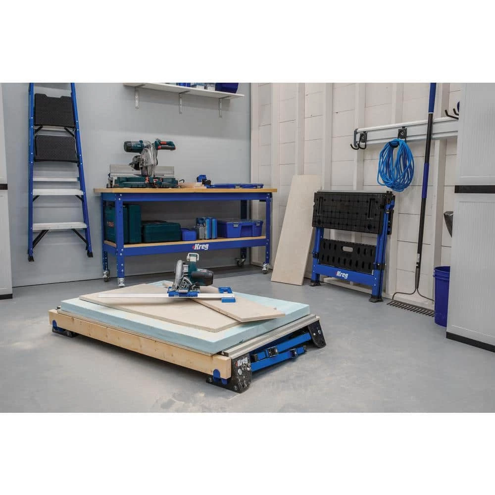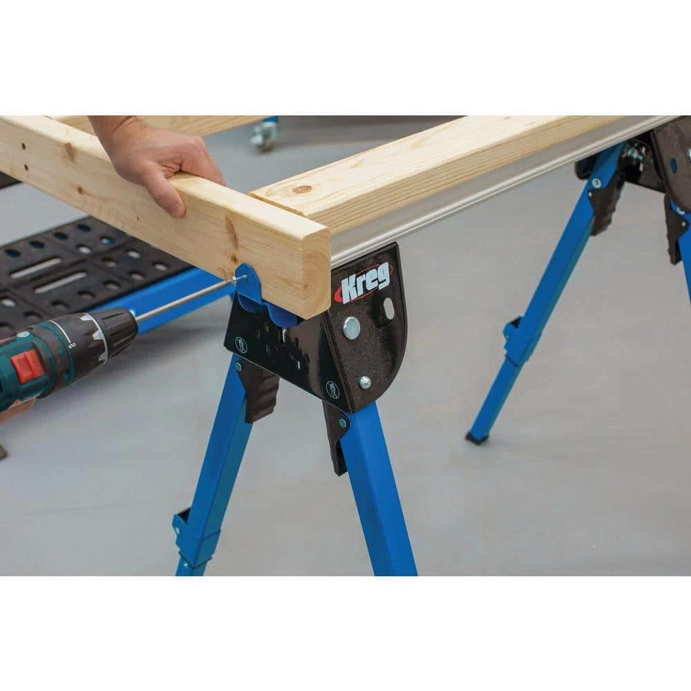 The Track Horse makes it easy to set up a sturdy work support anywhere to make any place your workspace. The Track Horse offers an array of features that give it capabilities beyond an ordinary sawhorse. Sturdy steel and aluminum construction makes the Track Horse sturdy, and gives it a capacity of 2,200 lbs. (997 kg) per pair, so it can handle large, heavy projects and materials with ease. Dual-mode clamping (with an included Kreg Bench Clamp) makes it easy to secure those items on the Track Horse-by holding them down on the long track on top, or using keyhole brackets on the ends for vise-style clamping. The track also accepts a sacrificial surface, which allows cutting without damaging the Track Horse or saw. When more cutting space is needed, just pair with another Track Horse the Mobile Project Center to create a large cutting platform. Or set up an extra-large work table just as easily. Adjustable legs feature 6 working heights to match any task. The legs also fold completely away. This allows using the Track Horse as a ground-level work platform, and means the Track Horse stores compactly away.